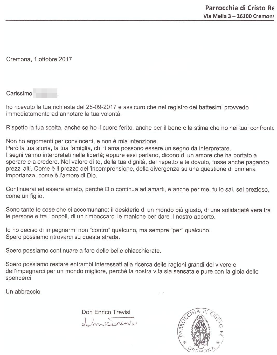 Una persona ha chiesto la rettifica dei dati relativi al proprio battesimo avvenuto a Cristo Re - CREMONA (CR) il 01/10/2017, dichiarando di non voler più far parte della Chiesa Cattolica.