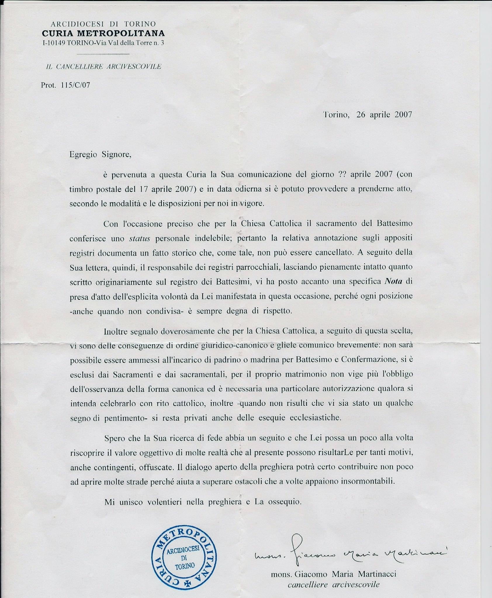Una persona ha chiesto la rettifica dei dati relativi al proprio battesimo avvenuto a S. Anna - TORINO (TO) il 26/04/2007, dichiarando di non voler più far parte della Chiesa Cattolica.