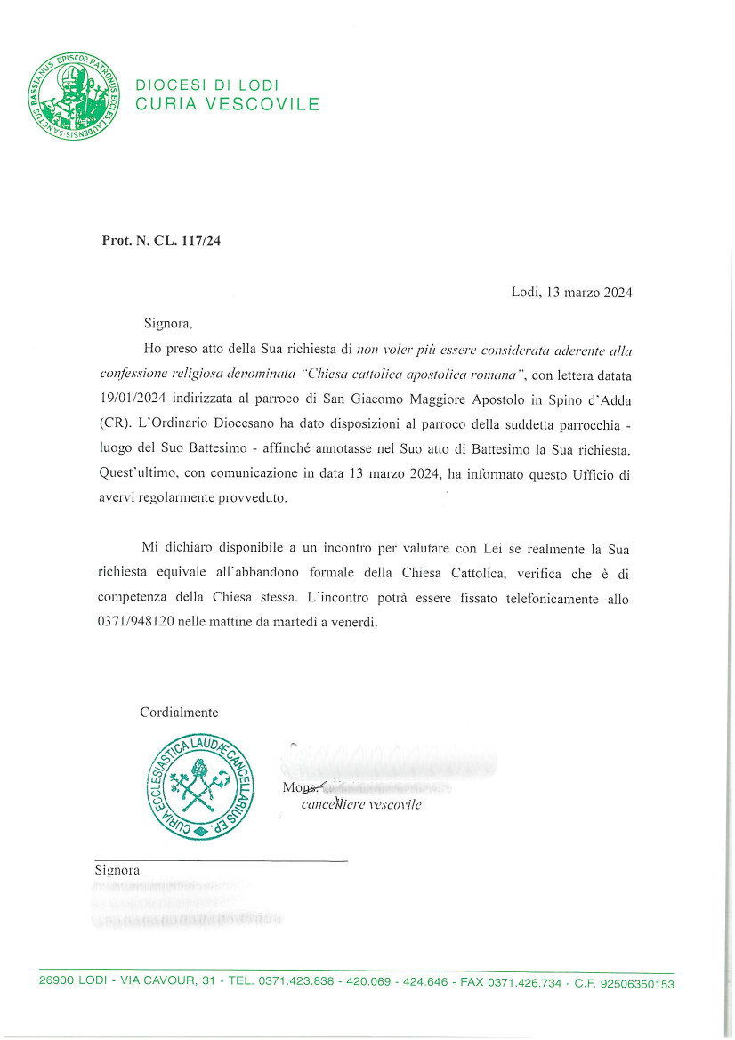 Una persona ha chiesto la rettifica dei dati relativi al proprio battesimo avvenuto a S. Giacomo Maggiore Apostolo - SPINO D'ADDA (CR) il 13/03/2024, dichiarando di non voler più far parte della Chiesa Cattolica.