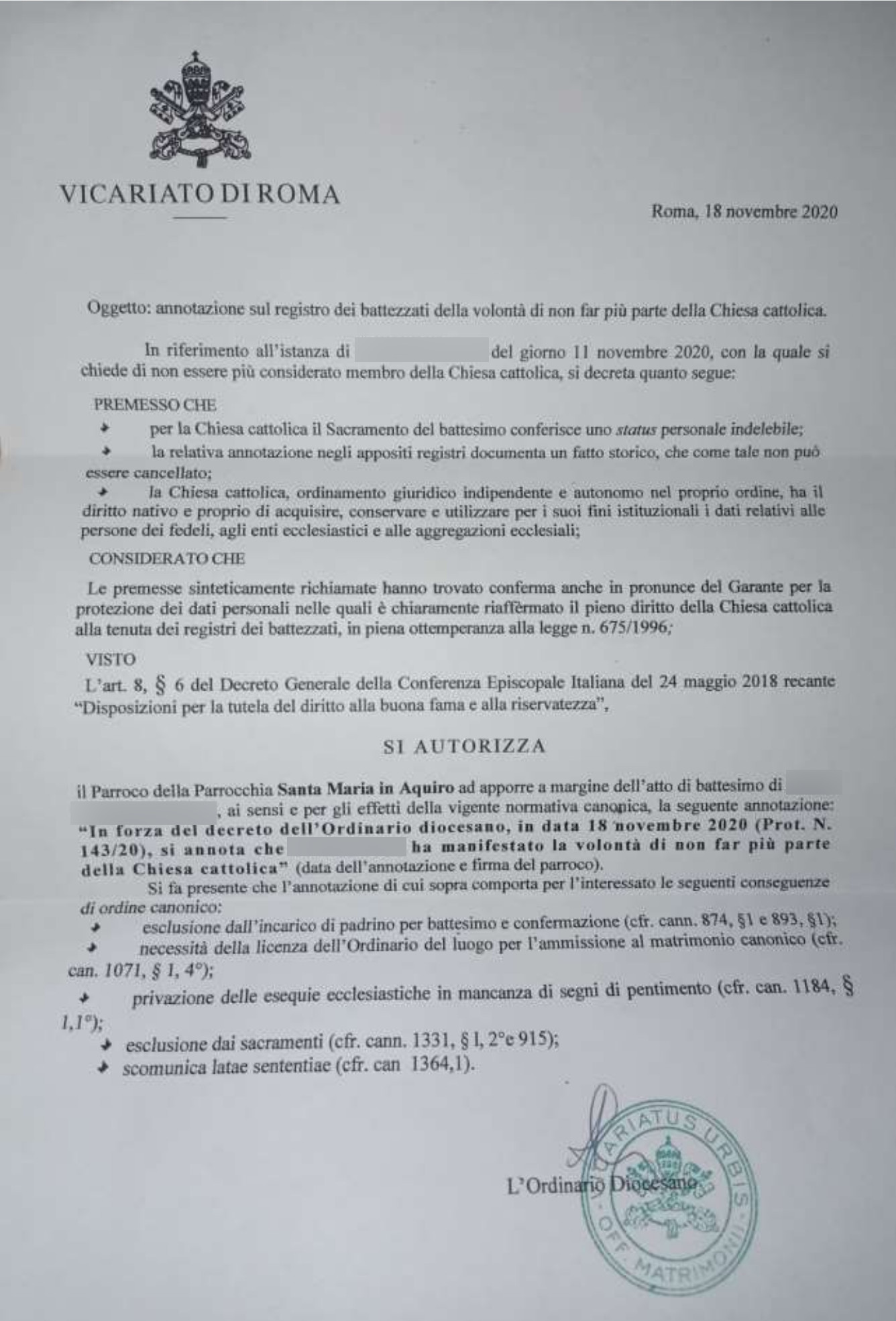 Una persona ha chiesto la rettifica dei dati relativi al proprio battesimo avvenuto a S. Maria in Aquiro - ROMA (RM) il 18/11/2020, dichiarando di non voler più far parte della Chiesa Cattolica.