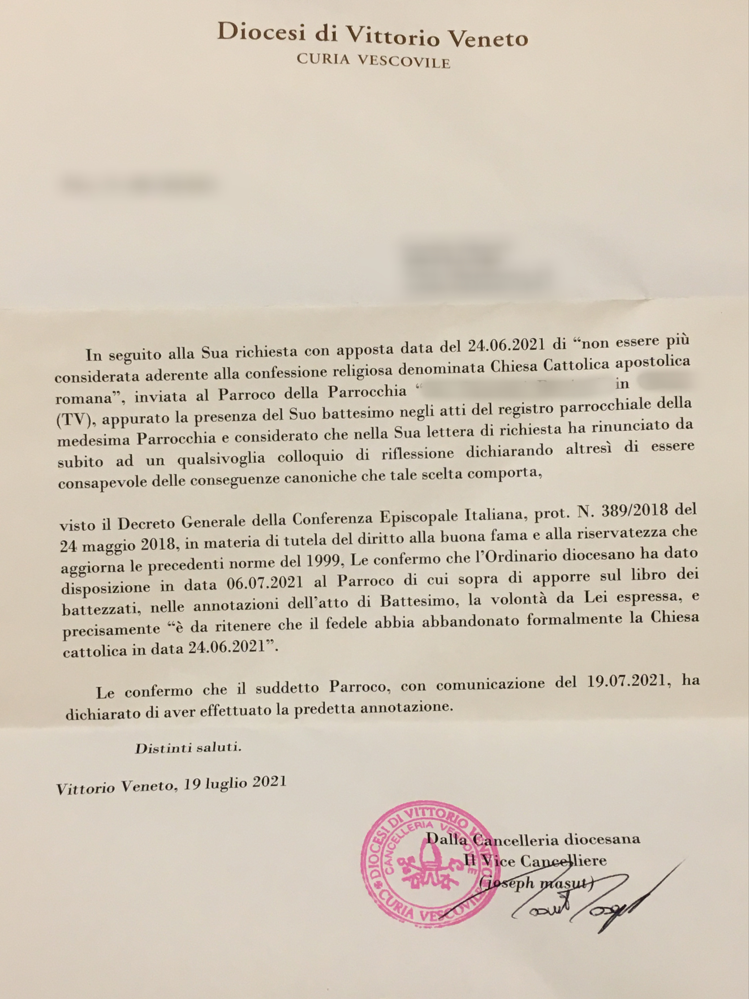 Una persona ha chiesto la rettifica dei dati relativi al proprio battesimo avvenuto a S. Giovanni Battista - ODERZO (TV) il 19/07/2021, dichiarando di non voler più far parte della Chiesa Cattolica.