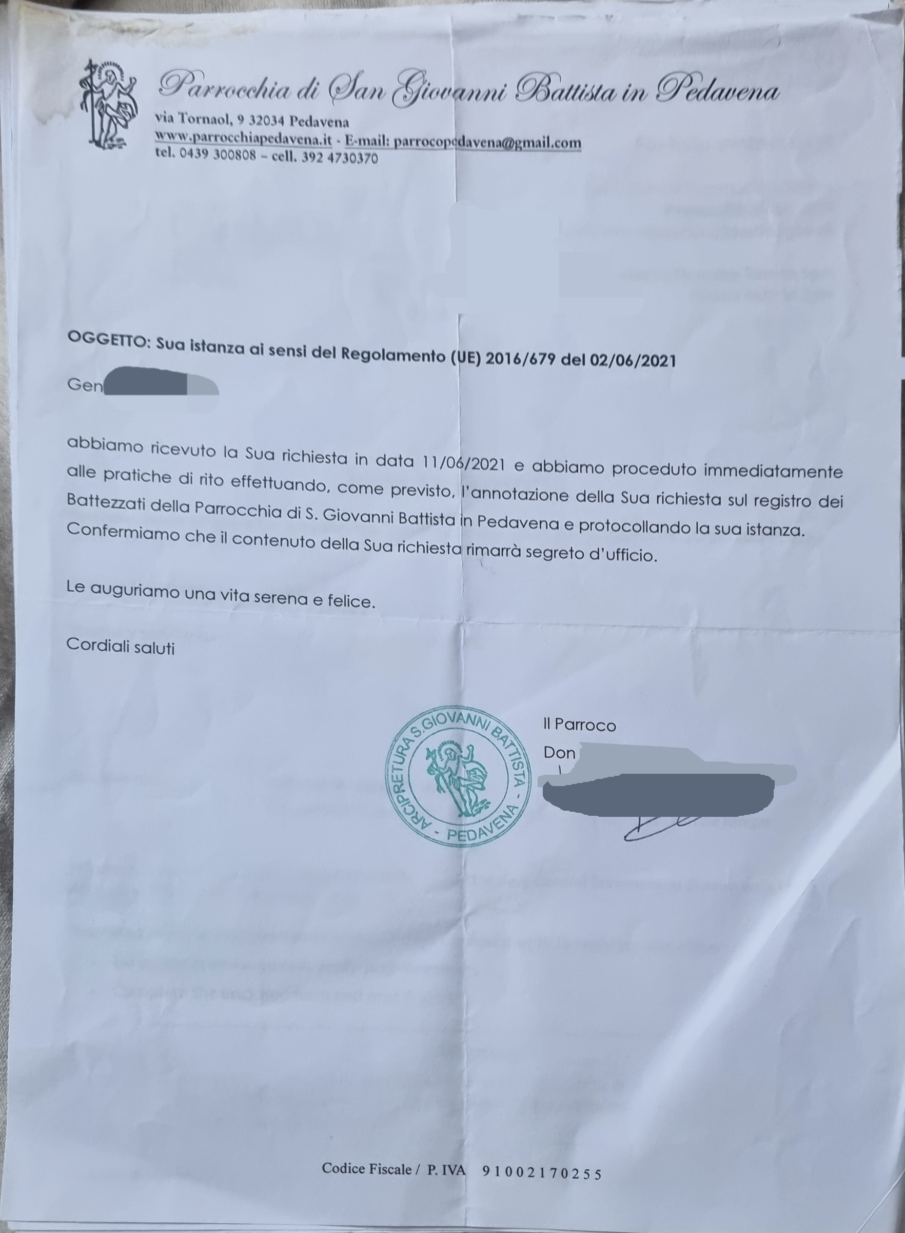 Una persona ha chiesto la rettifica dei dati relativi al proprio battesimo avvenuto a San Giovanni Battista - PEDAVENA (BL) il 31/12/2021, dichiarando di non voler più far parte della Chiesa Cattolica.