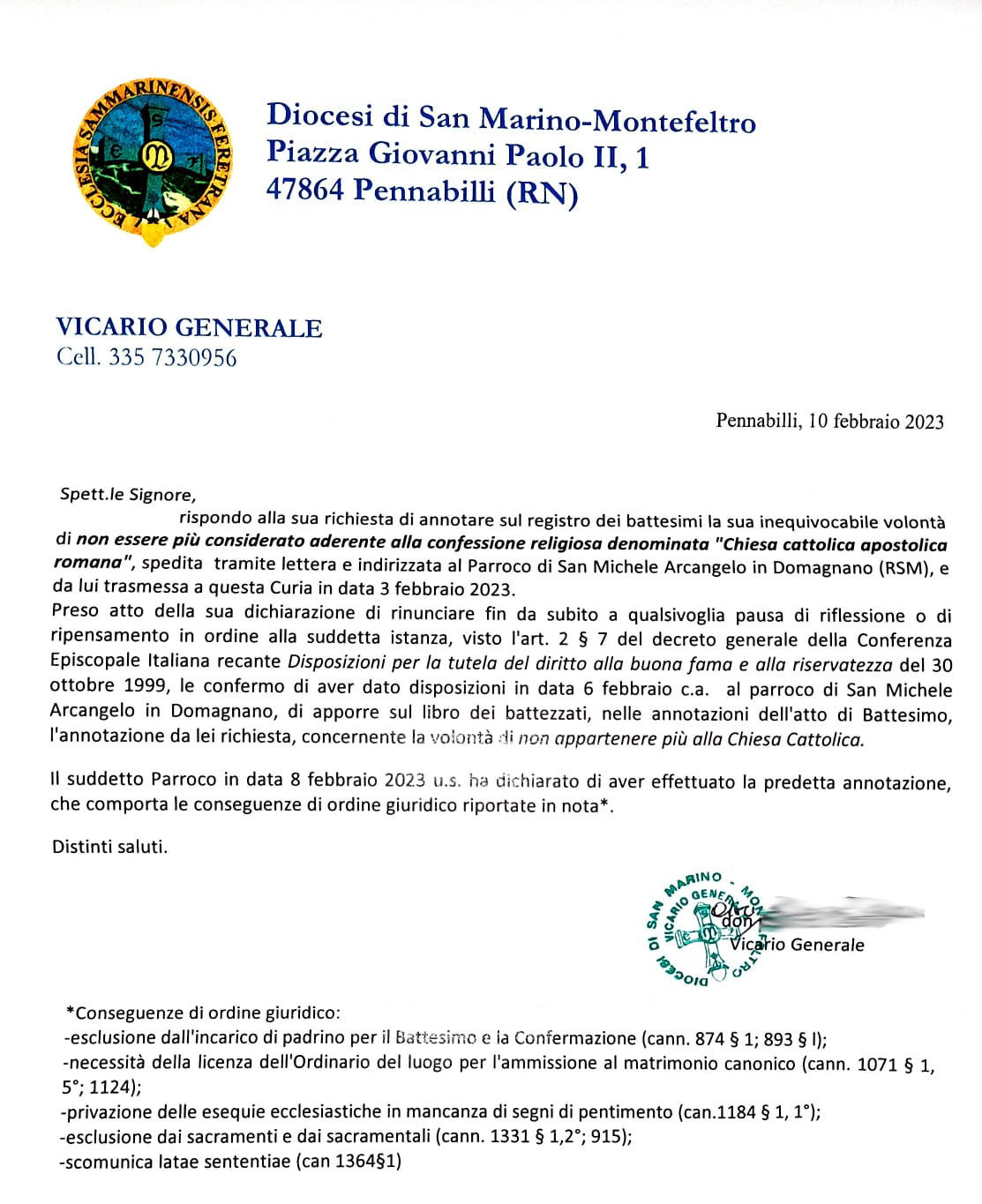 Una persona ha chiesto la rettifica dei dati relativi al proprio battesimo avvenuto a San Michele Arcangelo - DOMAGNANO DI REPUBBLICA DI SAN MARINO il 08/02/2023, dichiarando di non voler più far parte della Chiesa Cattolica.