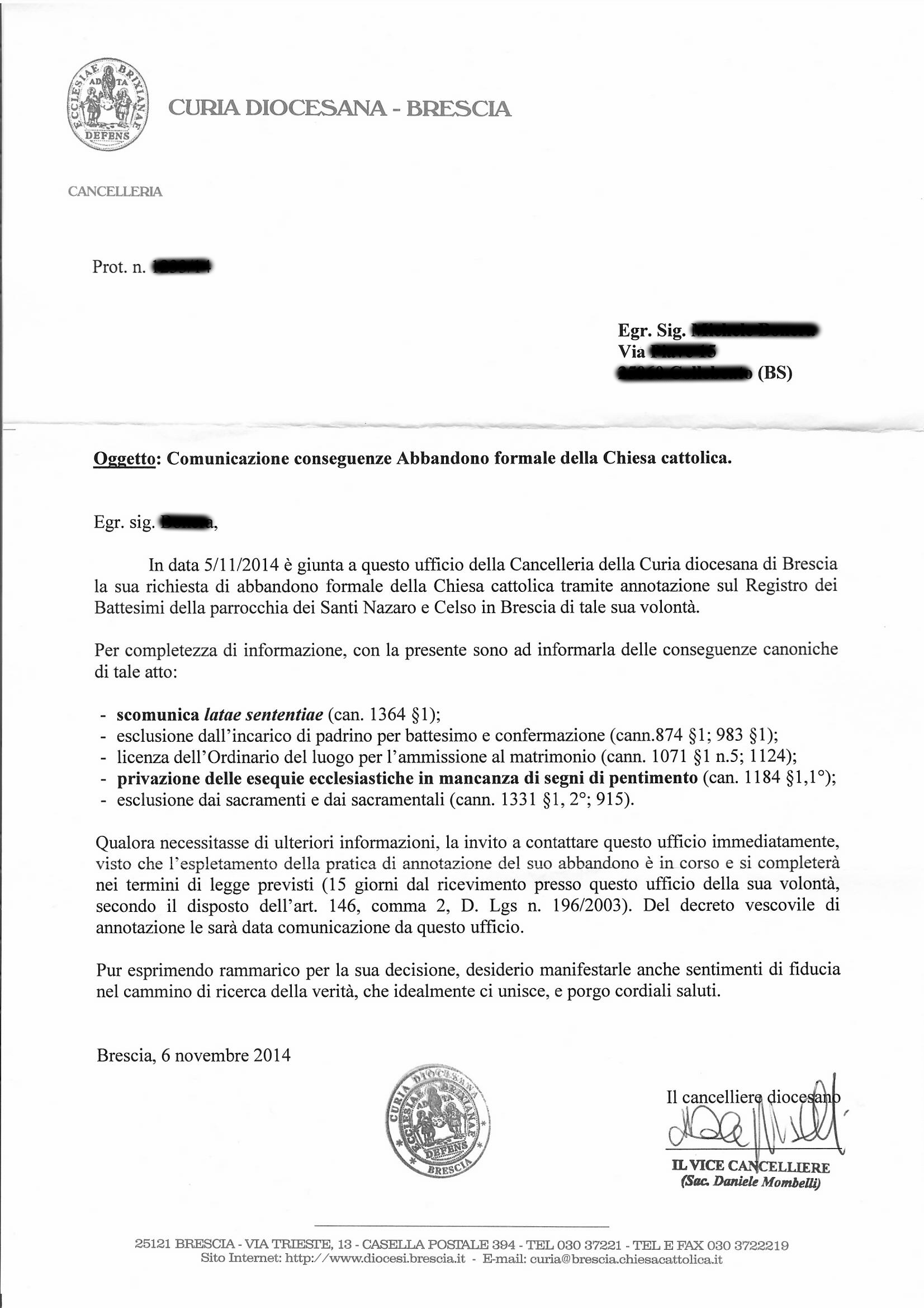 Una persona ha chiesto la rettifica dei dati relativi al proprio battesimo avvenuto a Santi Nazaro e Celso - BRESCIA (BS) il 06/11/2014, dichiarando di non voler più far parte della Chiesa Cattolica.