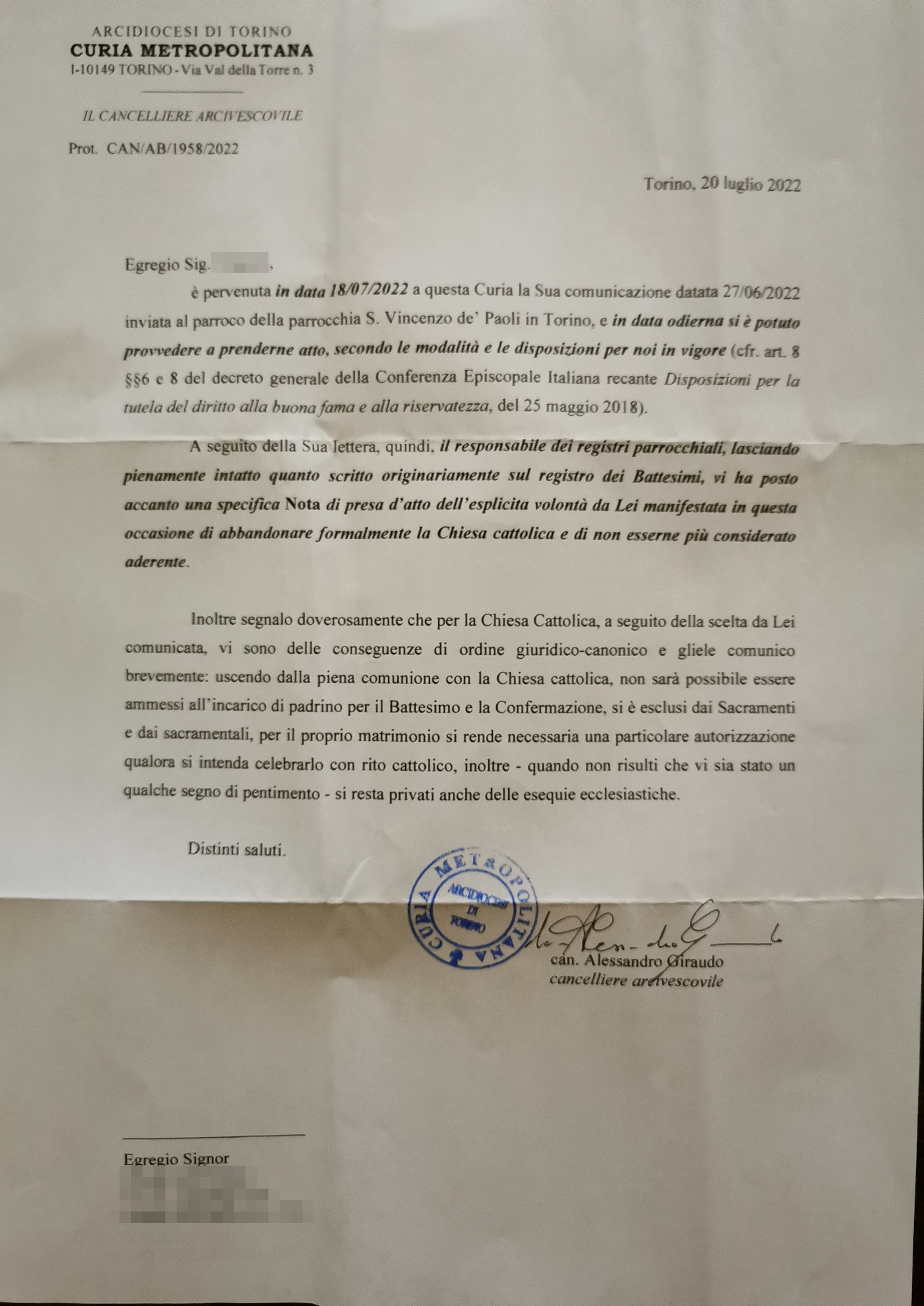 Una persona ha chiesto la rettifica dei dati relativi al proprio battesimo avvenuto a S. Vincenzo de' Paoli - TORINO (TO) il 20/07/2022, dichiarando di non voler più far parte della Chiesa Cattolica.