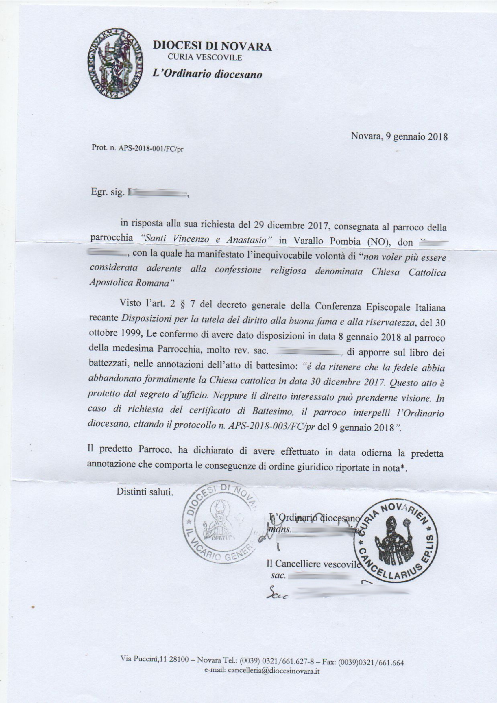 Una persona ha chiesto la rettifica dei dati relativi al proprio battesimo avvenuto a Santi Vincenzo e Anastasio - VARALLO POMBIA (NO) il 09/01/2018, dichiarando di non voler più far parte della Chiesa Cattolica.