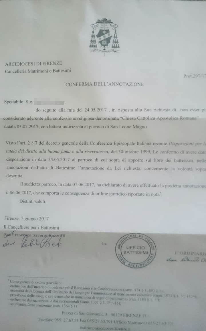Una persona ha chiesto la rettifica dei dati relativi al proprio battesimo avvenuto a S. Leone Magno a Firenze - FIRENZE (FI) il 07/06/2017, dichiarando di non voler più far parte della Chiesa Cattolica.