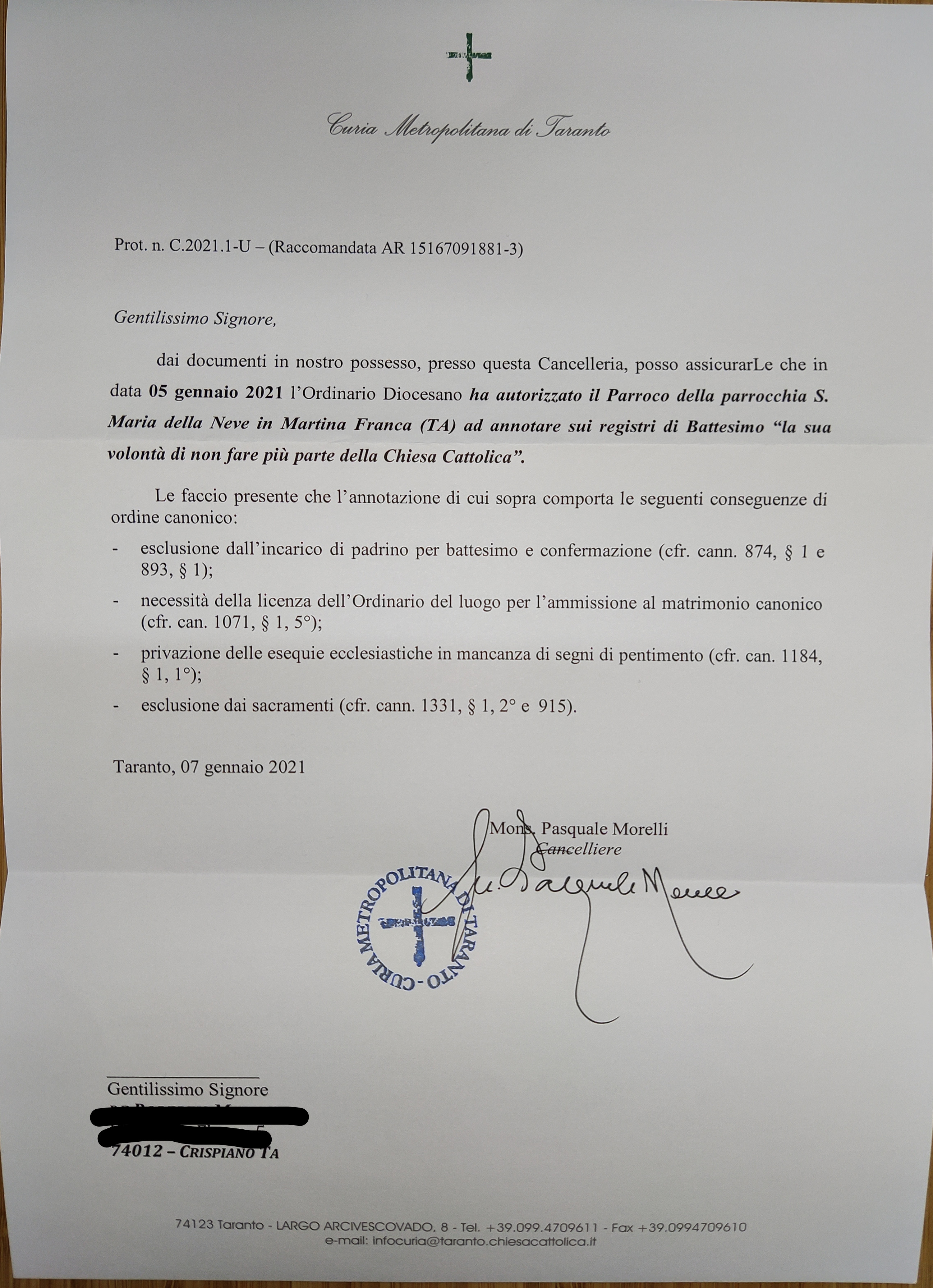 Una persona ha chiesto la rettifica dei dati relativi al proprio battesimo avvenuto a S. Maria della Neve - CRISPIANO (TA) il 12/01/2021, dichiarando di non voler più far parte della Chiesa Cattolica.