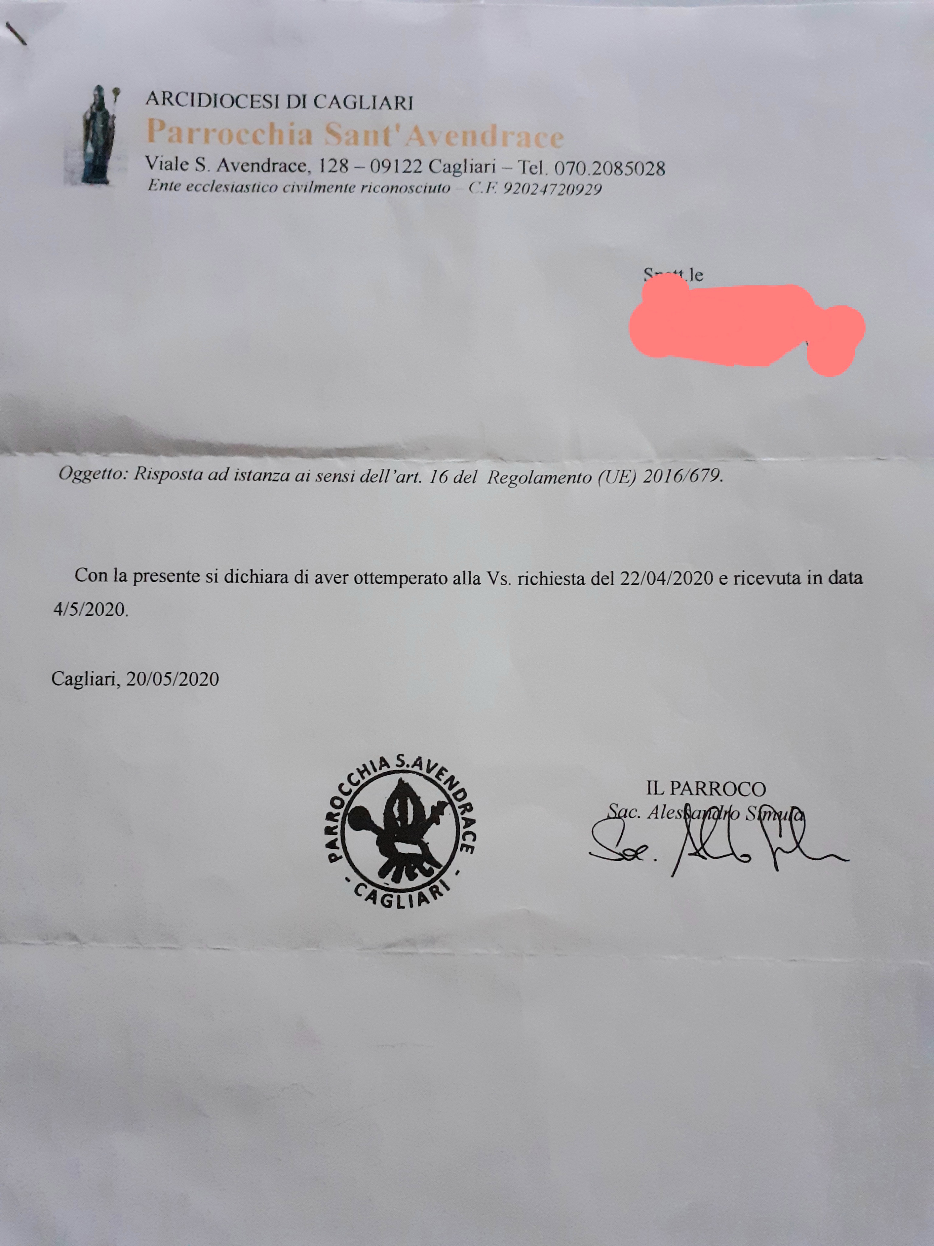 Una persona ha chiesto la rettifica dei dati relativi al proprio battesimo avvenuto a S. Avendrace - CAGLIARI (CA) il 20/05/2020, dichiarando di non voler più far parte della Chiesa Cattolica.