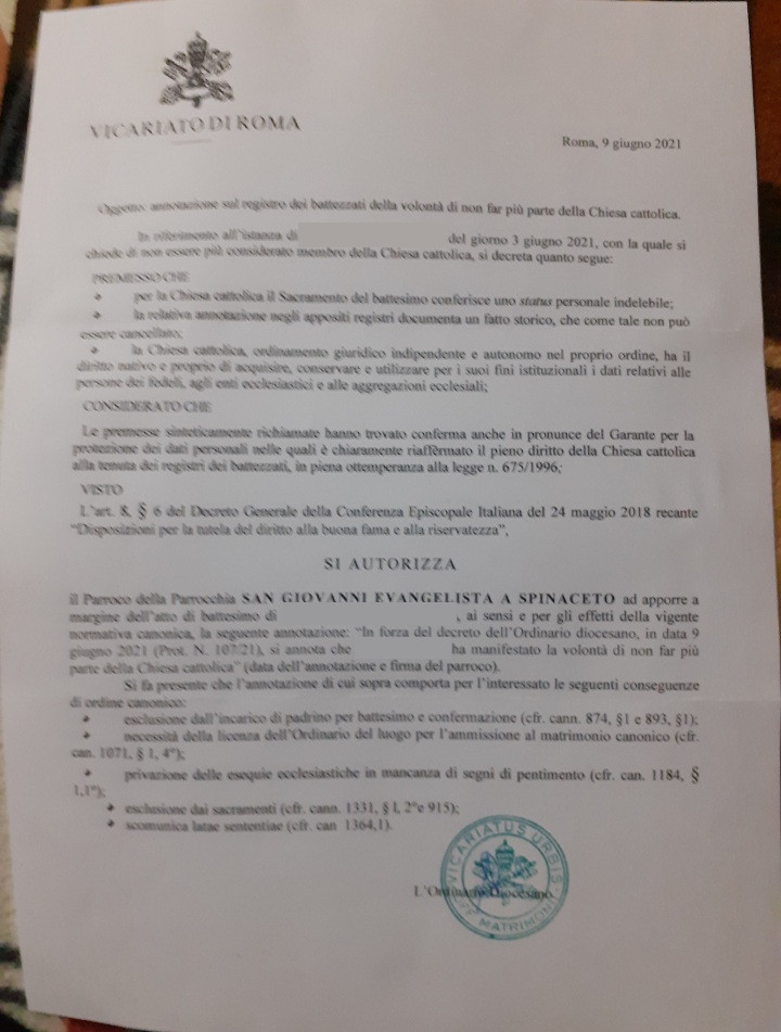 Una persona ha chiesto la rettifica dei dati relativi al proprio battesimo avvenuto a S. Giovanni Evangelista - ROMA (RM) il 09/06/2021, dichiarando di non voler più far parte della Chiesa Cattolica.