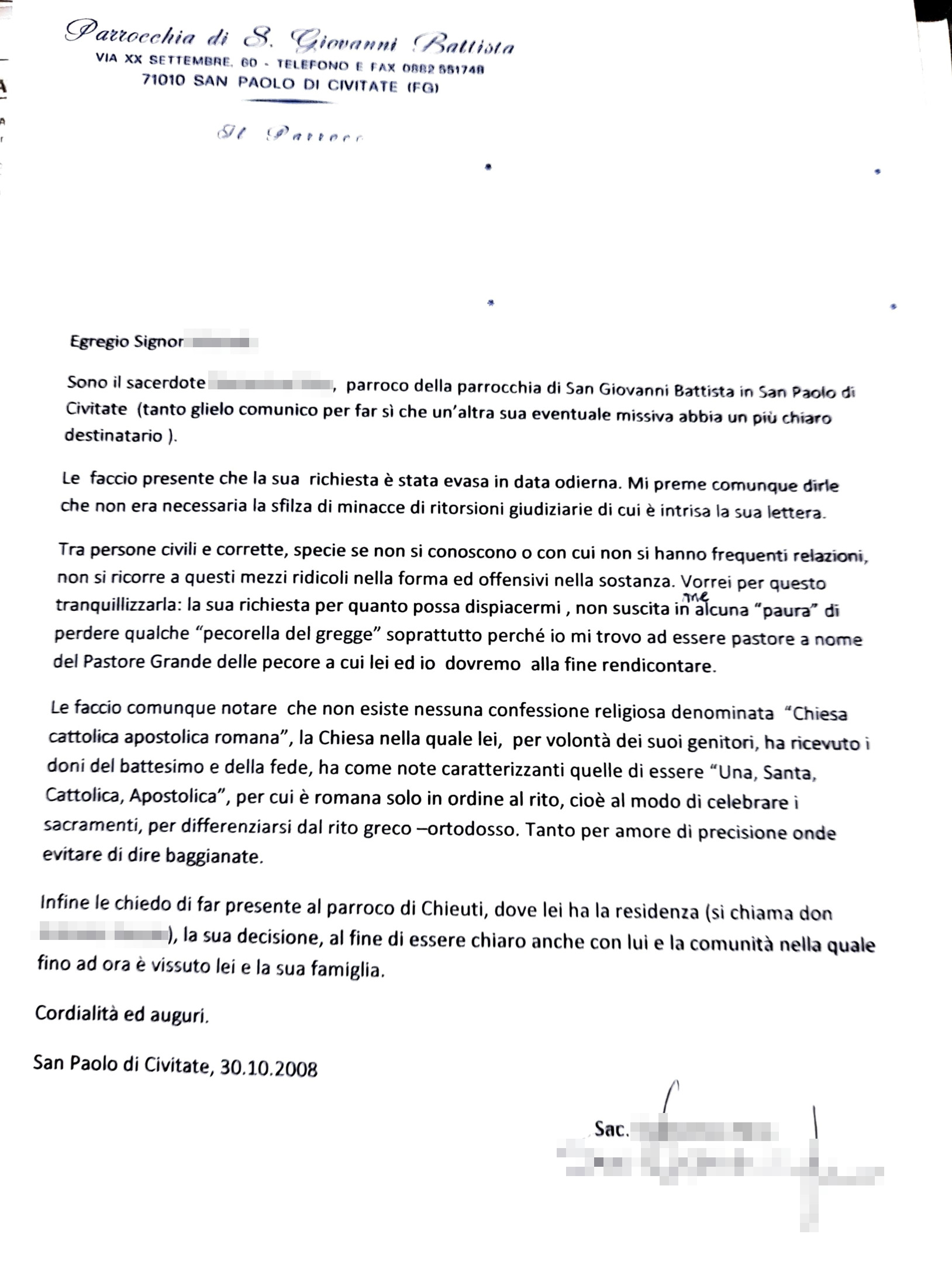 La risposta della Parrocchia (parroco) è stata piuttosto stizzita, ma ceIere,