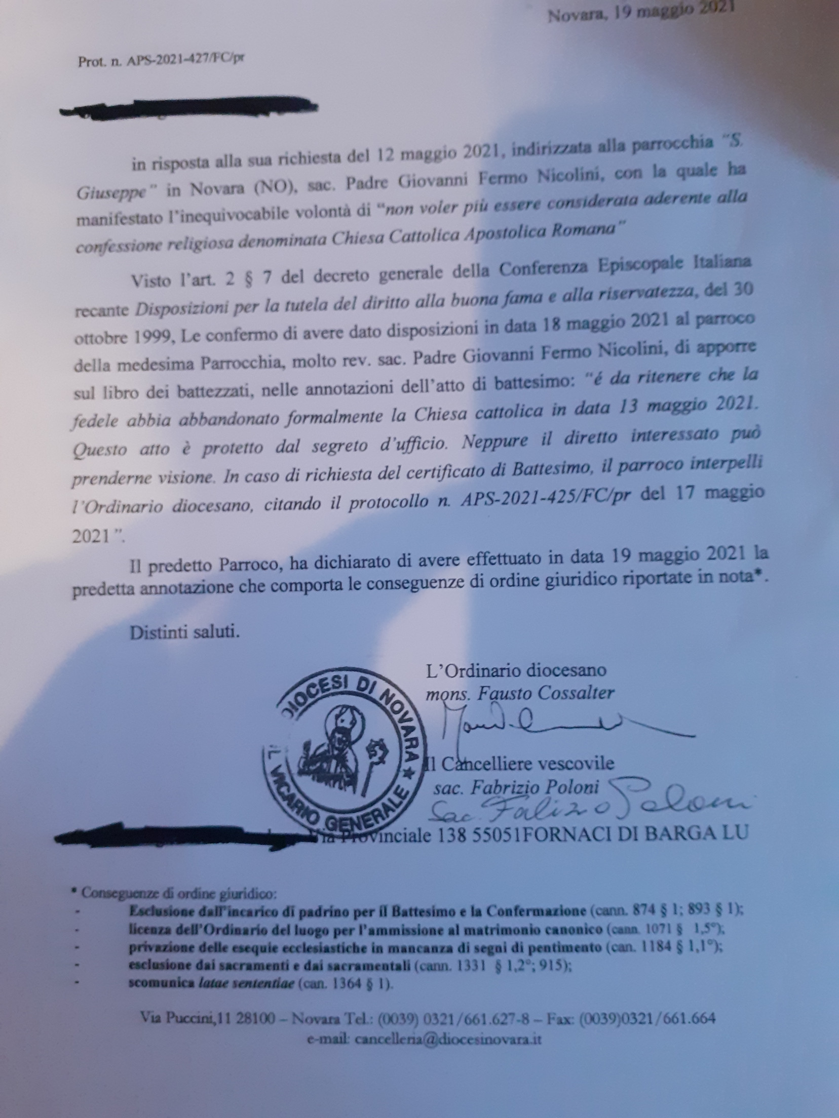 Una persona ha chiesto la rettifica dei dati relativi al proprio battesimo avvenuto a S. Giuseppe - NOVARA (NO) il 04/06/2021, dichiarando di non voler più far parte della Chiesa Cattolica.