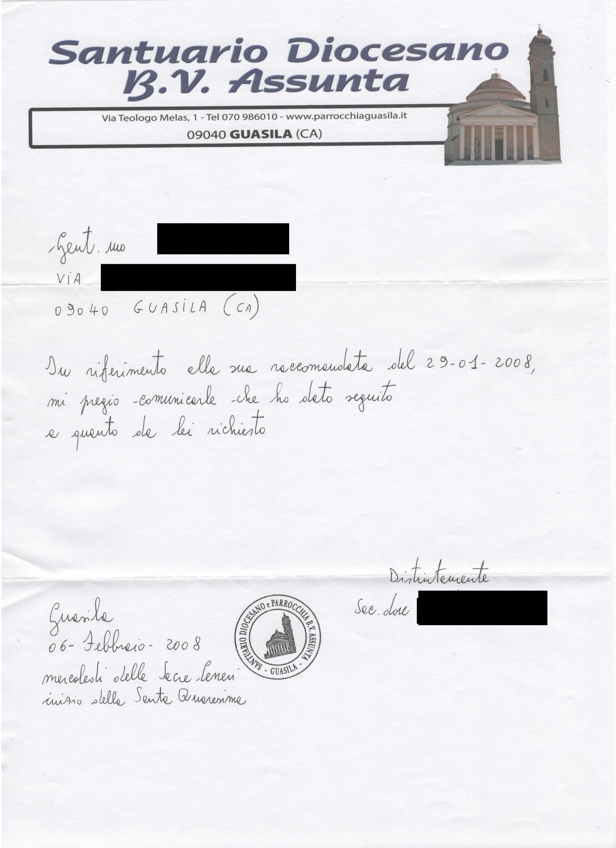 Una persona ha chiesto la rettifica dei dati relativi al proprio battesimo avvenuto a Beata Vergine Assunta - GUASILA (SU) il 06/02/2008, dichiarando di non voler più far parte della Chiesa Cattolica.