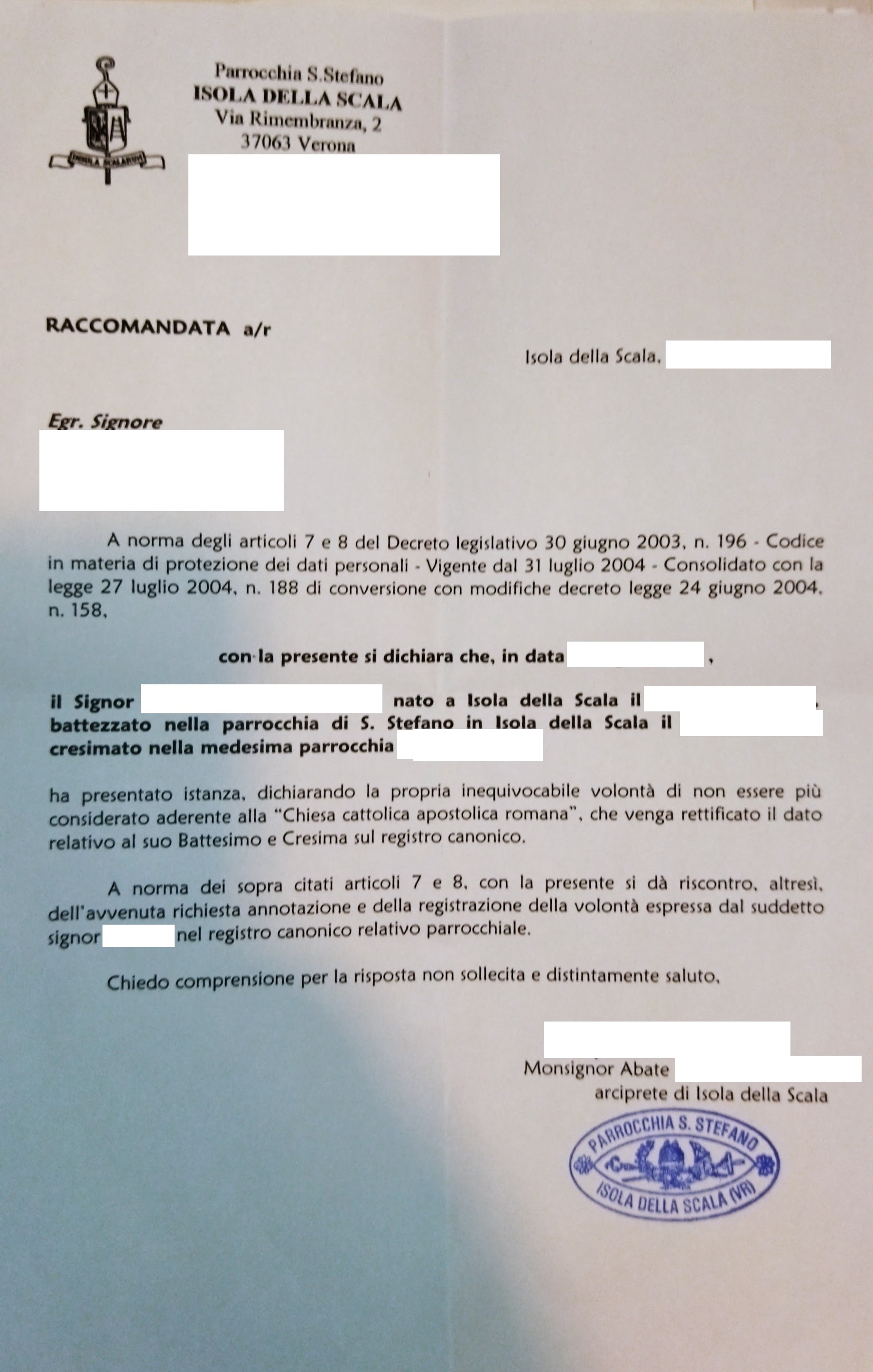 Una persona ha chiesto la rettifica dei dati relativi al proprio battesimo avvenuto a S. Stefano - ISOLA DELLA SCALA (VR) il 11/11/2007, dichiarando di non voler più far parte della Chiesa Cattolica.