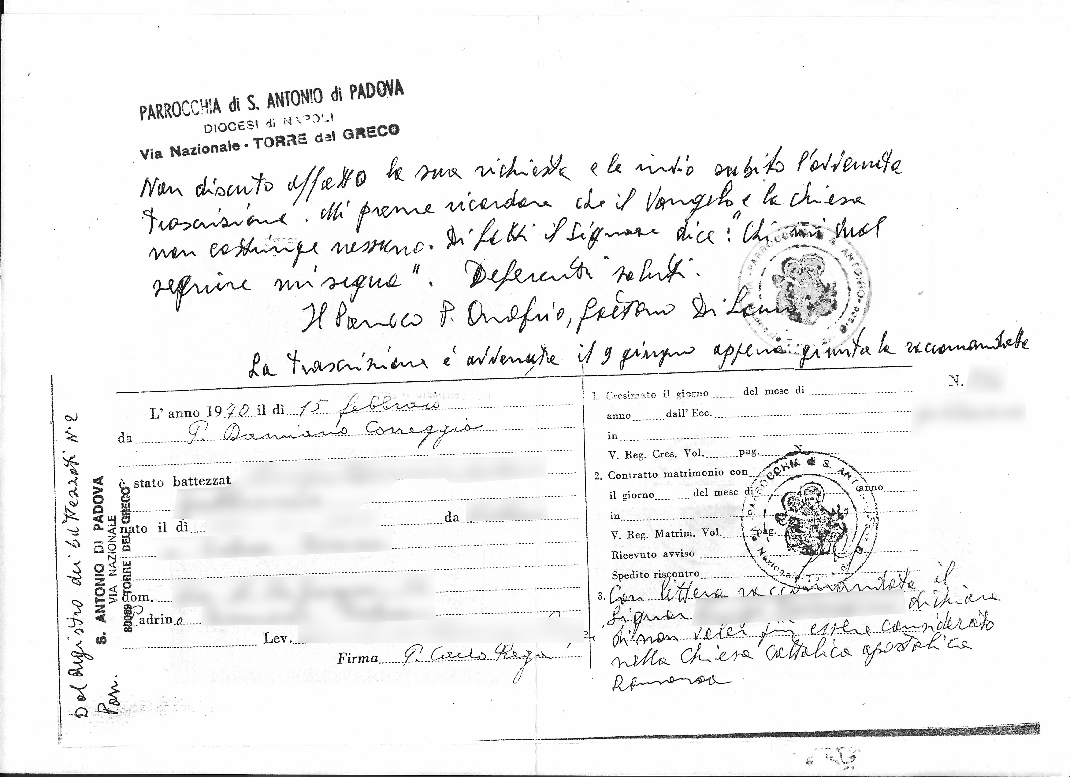 Una persona ha chiesto la rettifica dei dati relativi al proprio battesimo avvenuto a S. Antonio di Padova - TORRE DEL GRECO (NA) il 09/06/2009, dichiarando di non voler più far parte della Chiesa Cattolica.