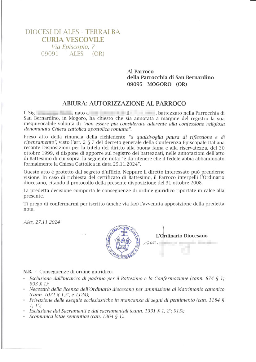 Una persona ha chiesto la rettifica dei dati relativi al proprio battesimo avvenuto a S. Bernardino - MOGORO (OR) il 29/11/2024, dichiarando di non voler più far parte della Chiesa Cattolica.