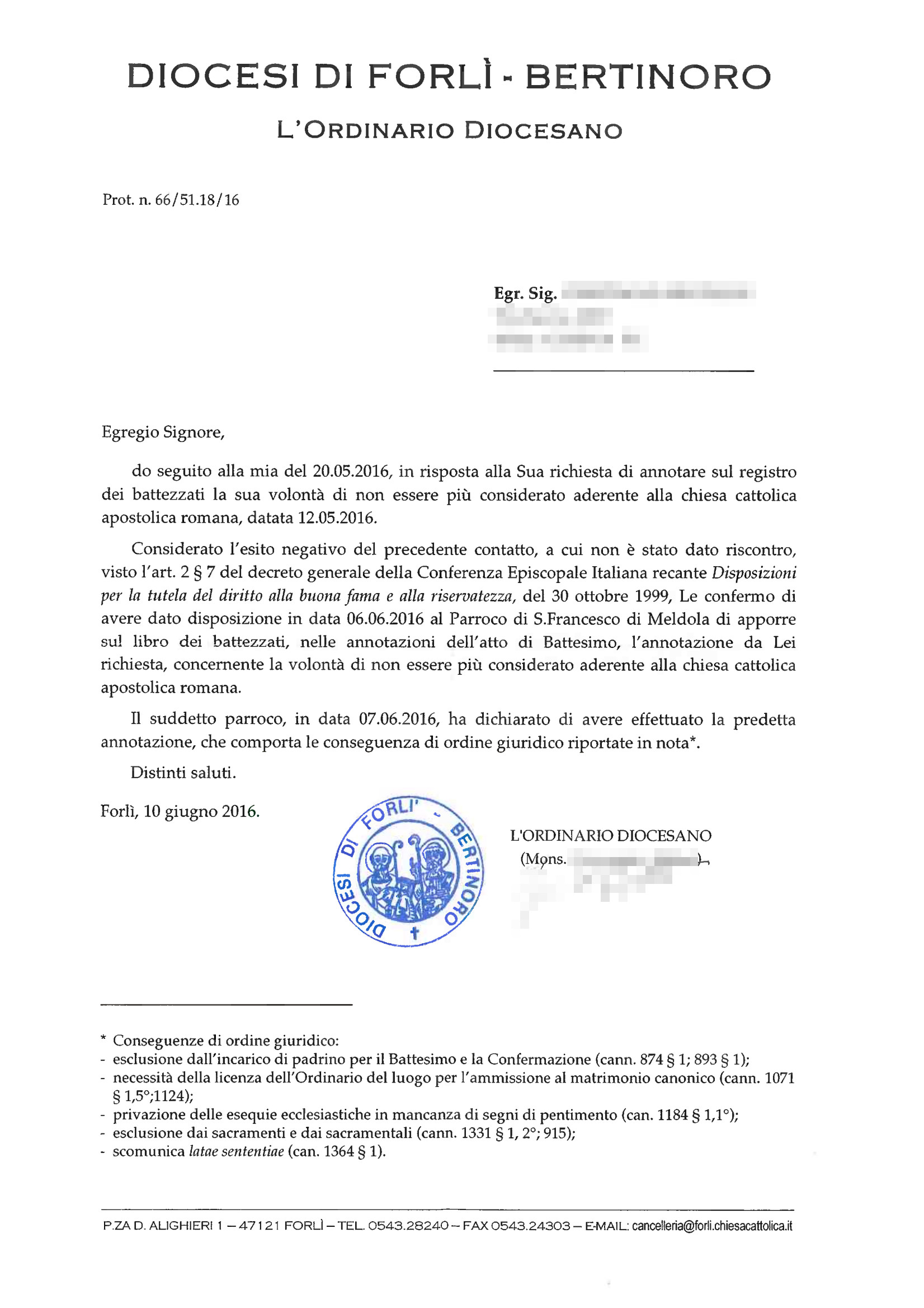 Ho mandato la A/R il sacerdote mi ha risposto chiedendo un incontro a cui chiaramente non sono andato, dopo 30 giorni mi è arrivata la comunicazione dalla curia che mi avevano cancellato.