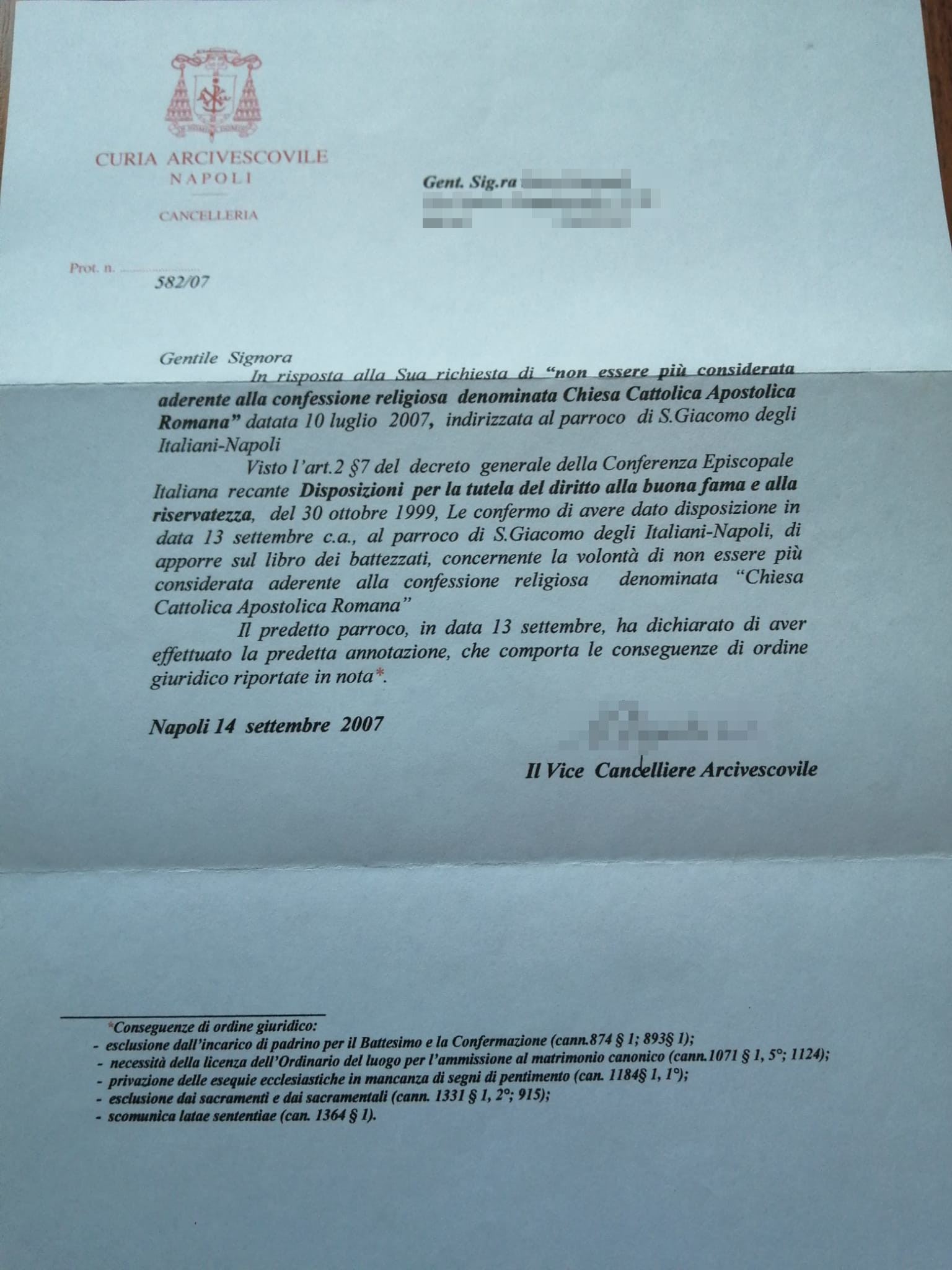 Una persona ha chiesto la rettifica dei dati relativi al proprio battesimo avvenuto a S. Giacomo Degli Italiani - NAPOLI (NA) il 14/09/2007, dichiarando di non voler più far parte della Chiesa Cattolica.