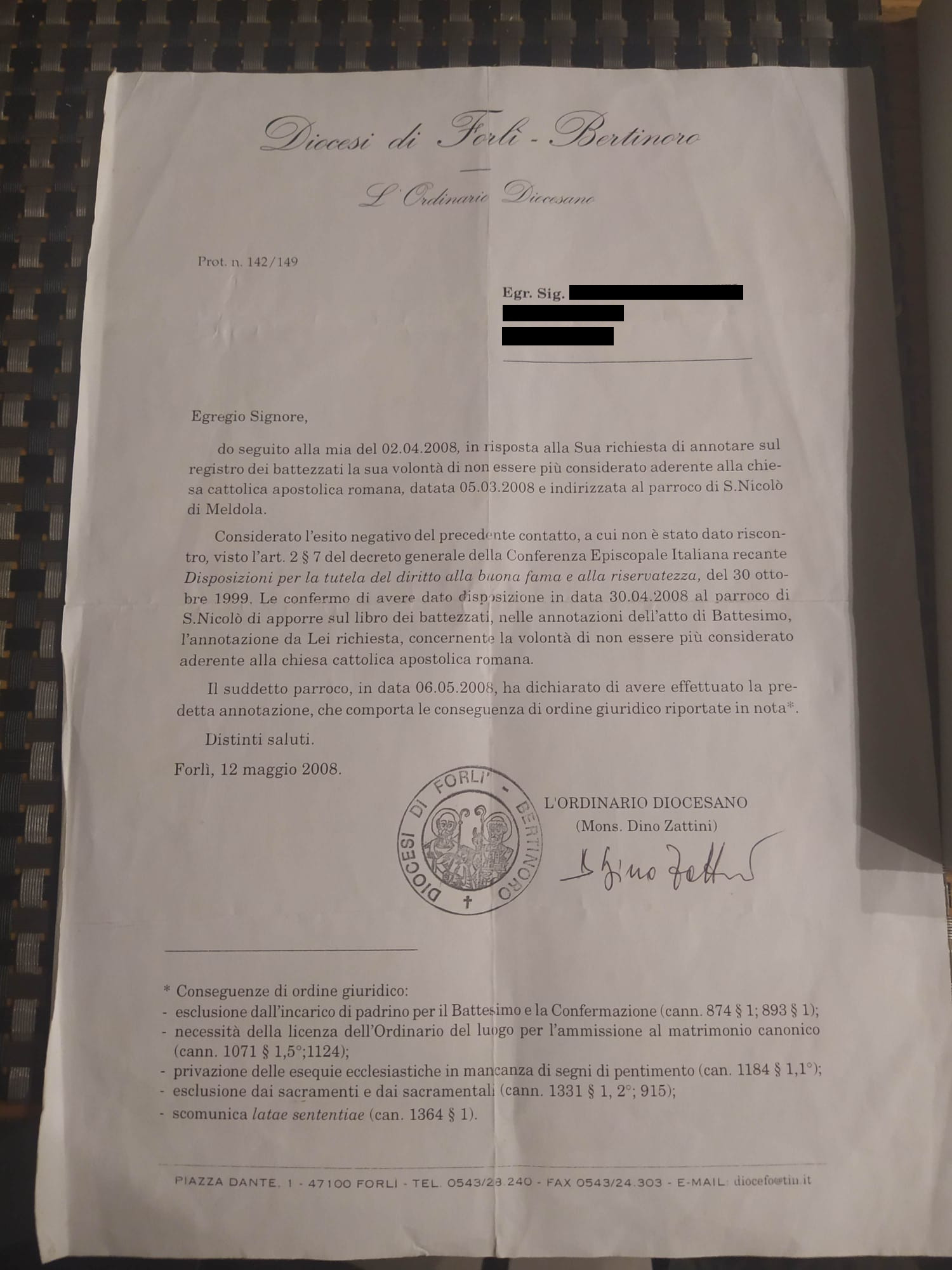 Una persona ha chiesto la rettifica dei dati relativi al proprio battesimo avvenuto a S. Nicolò - MELDOLA (FC) il 12/05/2008, dichiarando di non voler più far parte della Chiesa Cattolica.