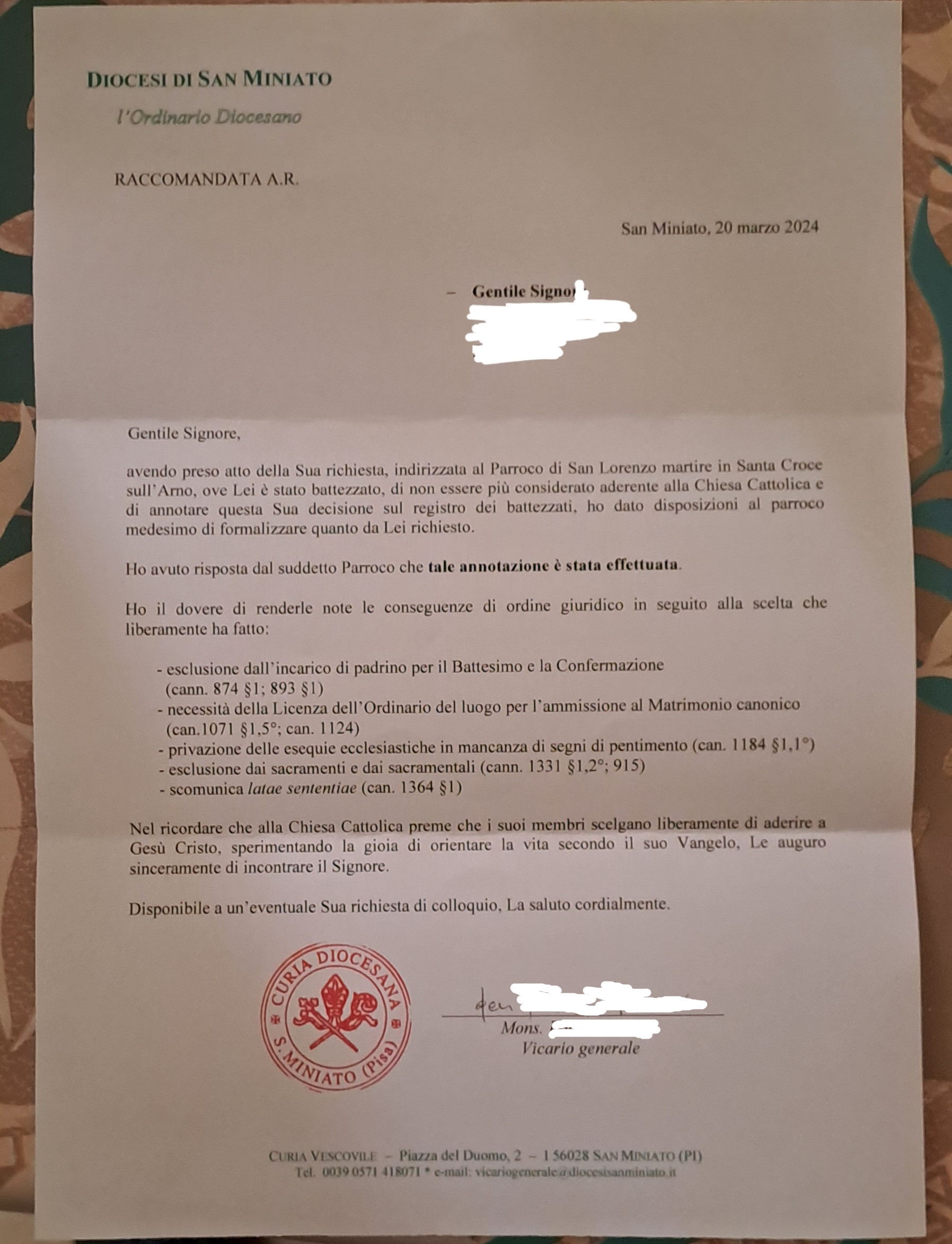 Una persona ha chiesto la rettifica dei dati relativi al proprio battesimo avvenuto a Collegiata di San Lorenzo - SANTA CROCE SULL'ARNO (PI) il 25/03/2024, dichiarando di non voler più far parte della Chiesa Cattolica.