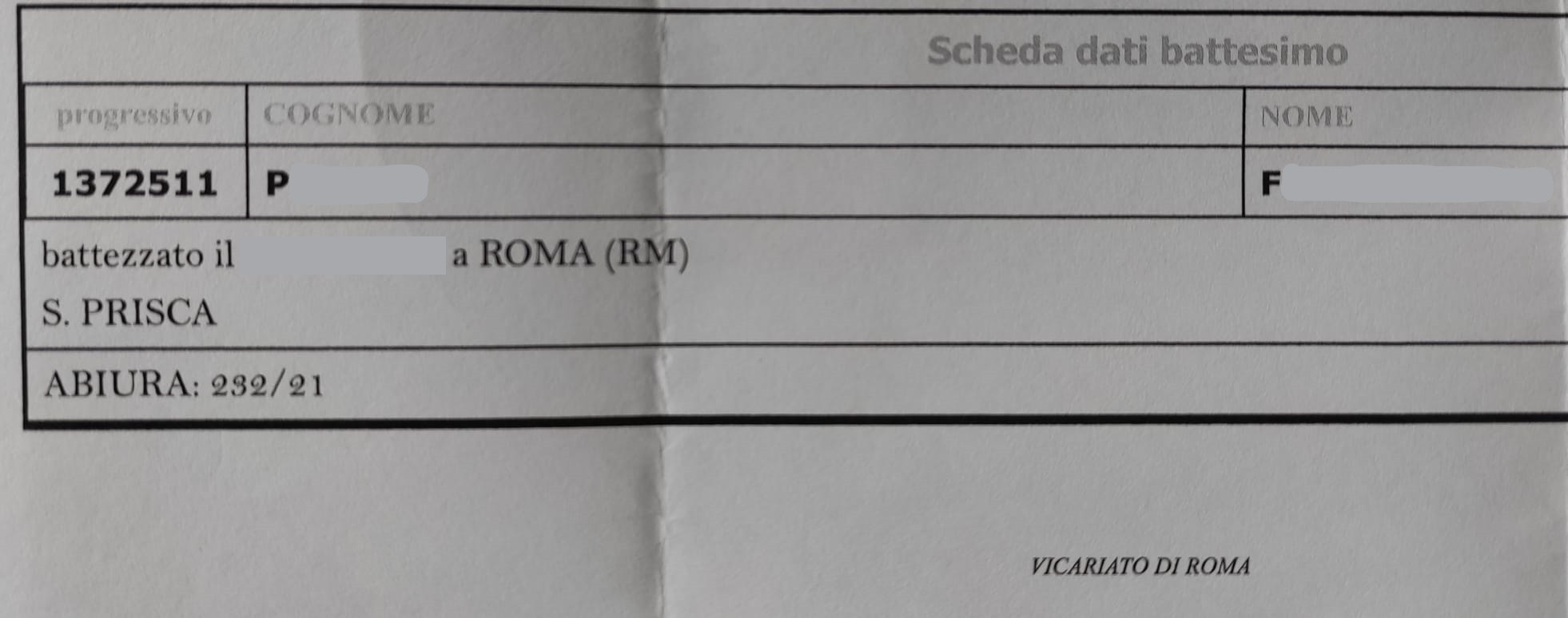Una persona ha chiesto la rettifica dei dati relativi al proprio battesimo avvenuto a S. Prisca - ROMA (RM) il 09/09/2021, dichiarando di non voler più far parte della Chiesa Cattolica.