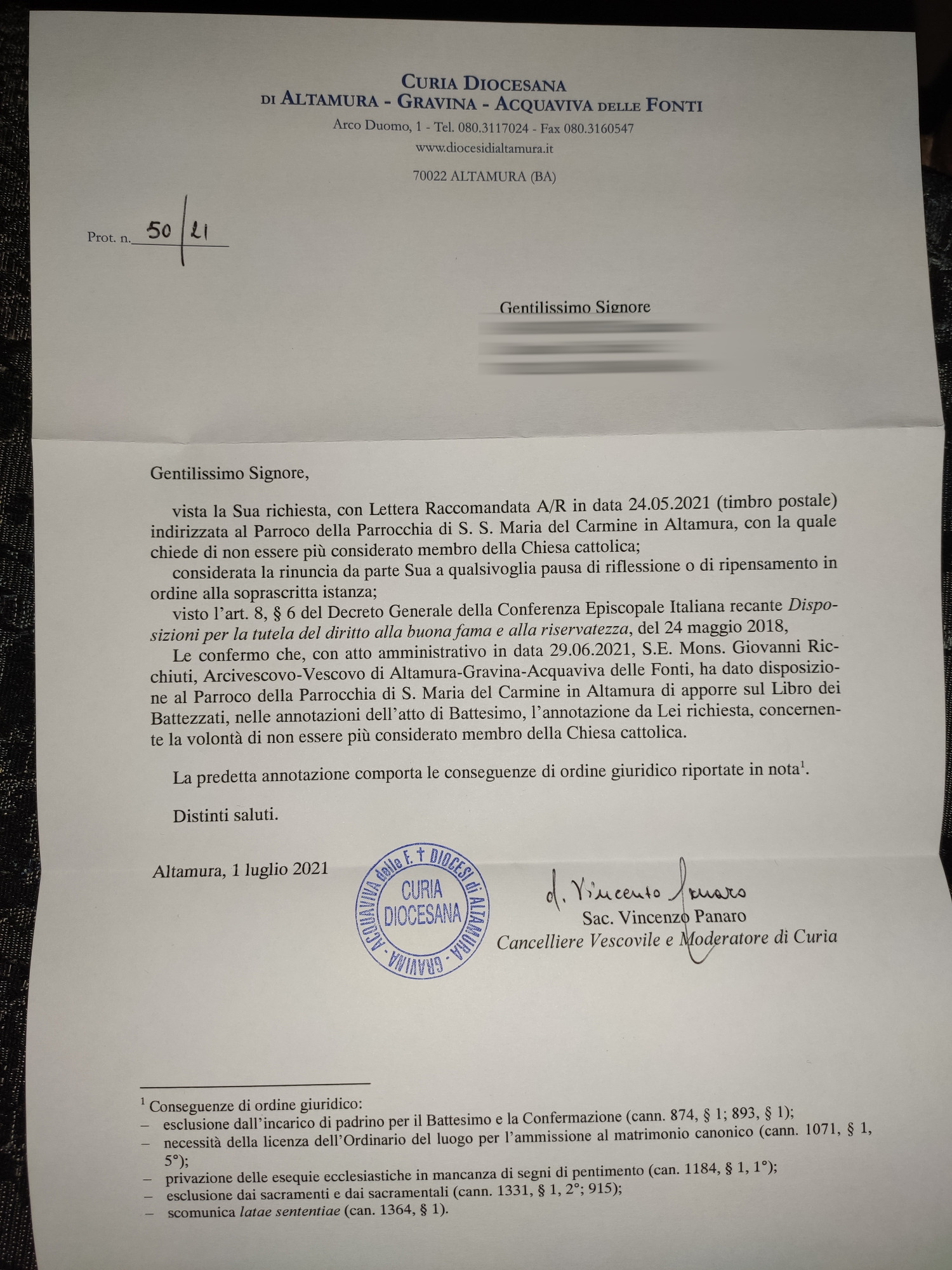 Una persona ha chiesto la rettifica dei dati relativi al proprio battesimo avvenuto a S. Maria del Carmine - ALTAMURA (BA) il 01/07/2021, dichiarando di non voler più far parte della Chiesa Cattolica.