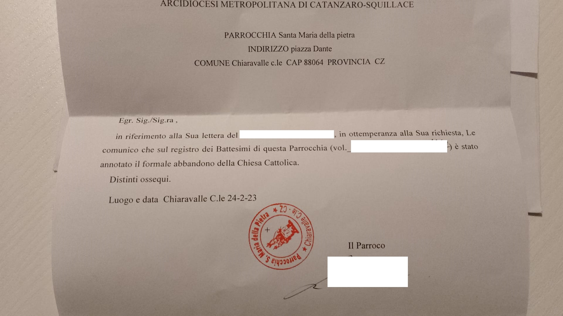 Una persona ha chiesto la rettifica dei dati relativi al proprio battesimo avvenuto a S. Maria della Pietra - CHIARAVALLE CENTRALE (CZ) il 24/02/2023, dichiarando di non voler più far parte della Chiesa Cattolica.