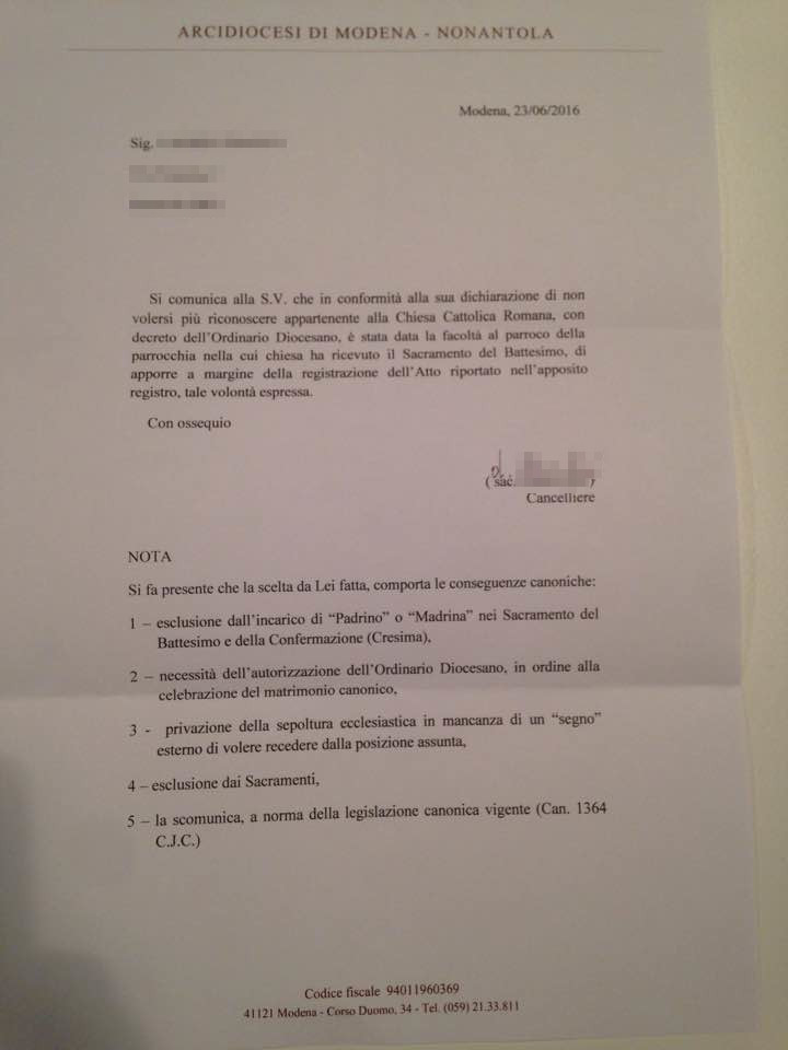 Una persona ha chiesto la rettifica dei dati relativi al proprio battesimo avvenuto a Ss. Crocifisso - MODENA (MO) il 20/07/2016, dichiarando di non voler più far parte della Chiesa Cattolica.
