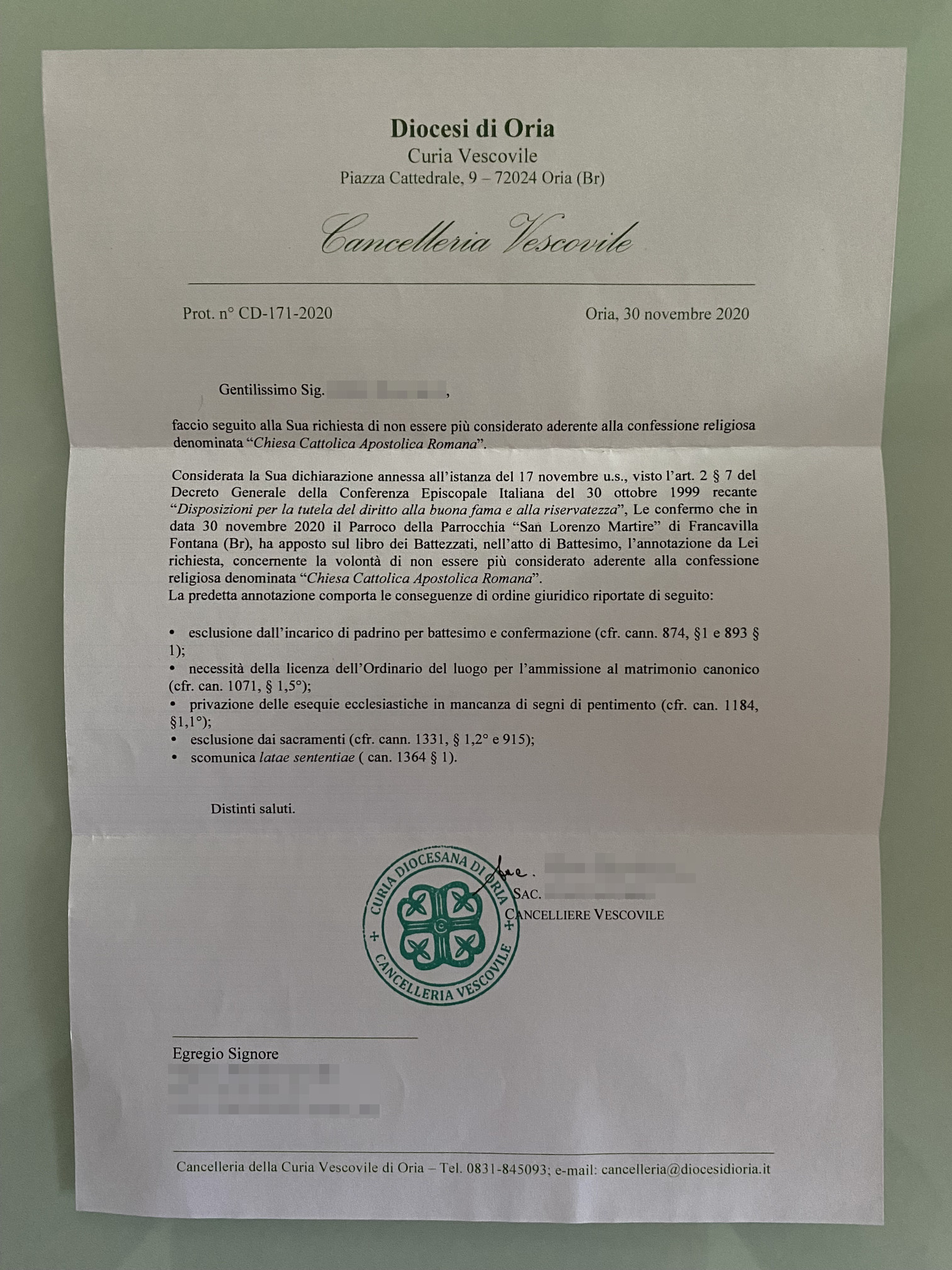 Una persona ha chiesto la rettifica dei dati relativi al proprio battesimo avvenuto a S. Lorenzo Martire - FRANCAVILLA FONTANA (BR) il 30/11/2020, dichiarando di non voler più far parte della Chiesa Cattolica.