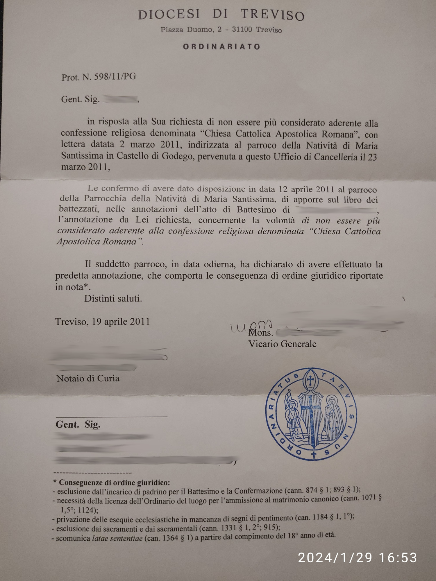 Una persona ha chiesto la rettifica dei dati relativi al proprio battesimo avvenuto a Natività di Maria Ss. - CASTELLO DI GODEGO (TV) il 19/04/2011, dichiarando di non voler più far parte della Chiesa Cattolica.
