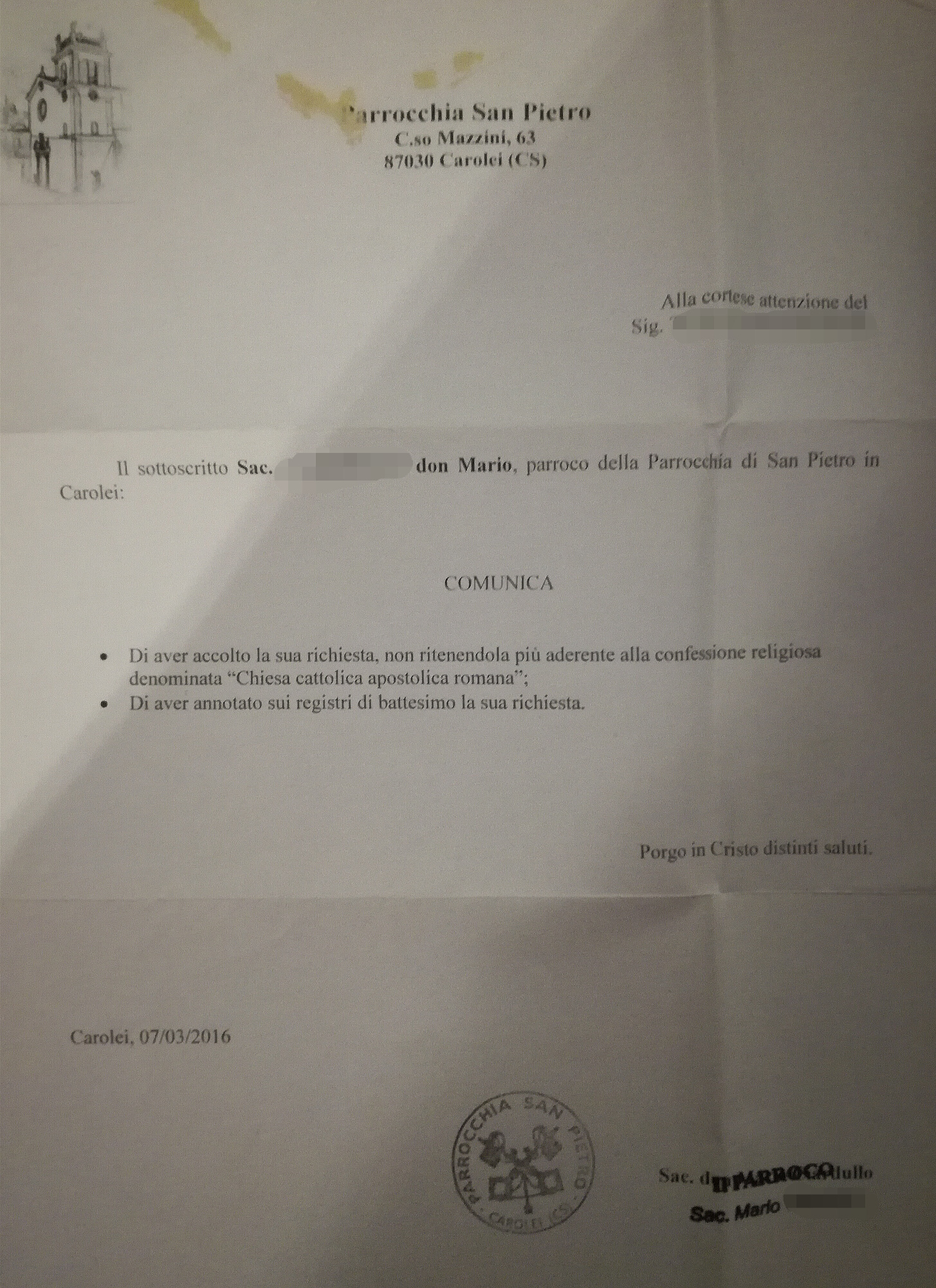 Una persona ha chiesto la rettifica dei dati relativi al proprio battesimo avvenuto a S. Pietro - CAROLEI (CS) il 07/03/2016, dichiarando di non voler più far parte della Chiesa Cattolica.