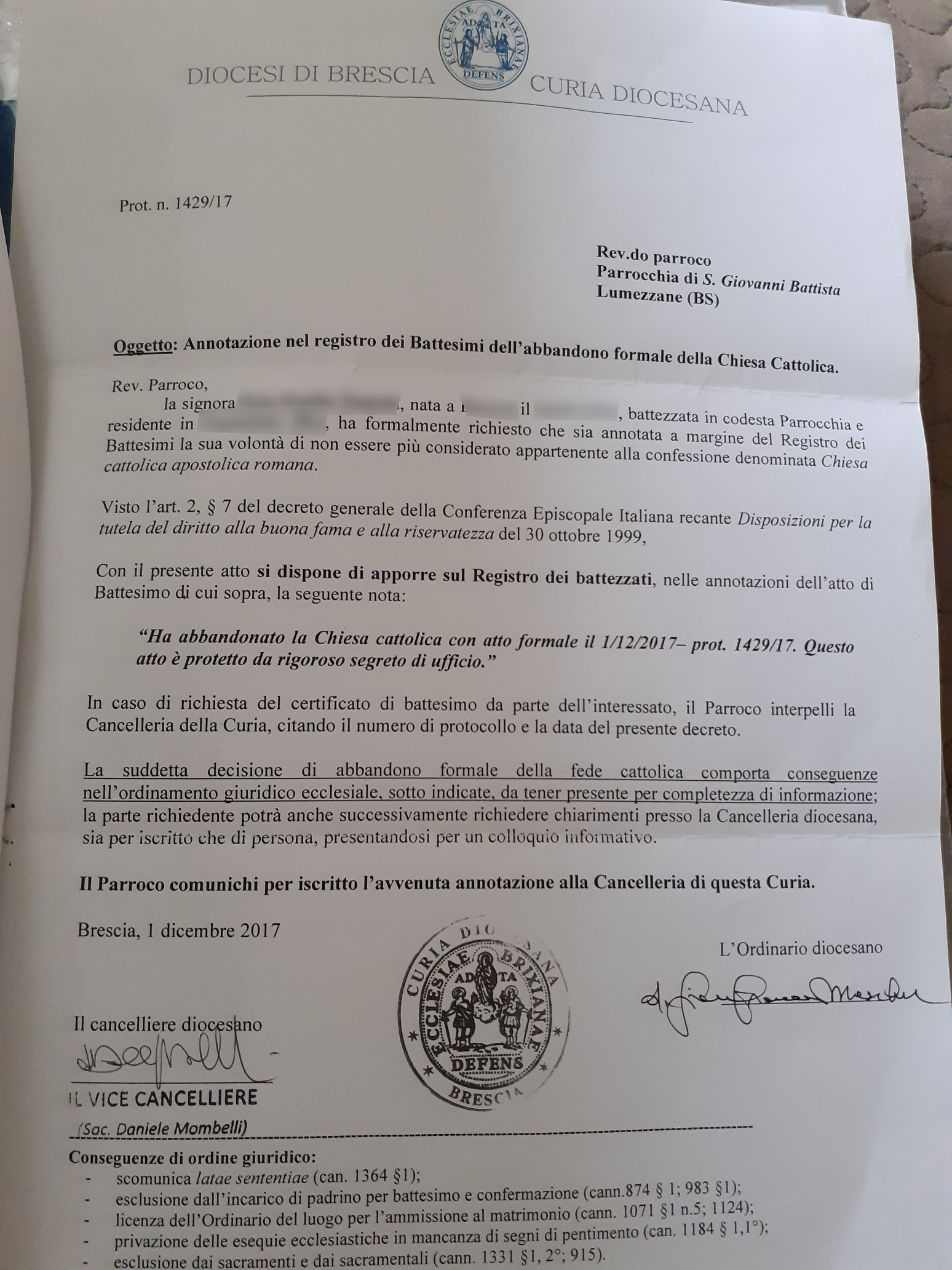 Una persona ha chiesto la rettifica dei dati relativi al proprio battesimo avvenuto a S. Giovanni Battista - LUMEZZANE (BS) il 05/12/2017, dichiarando di non voler più far parte della Chiesa Cattolica.