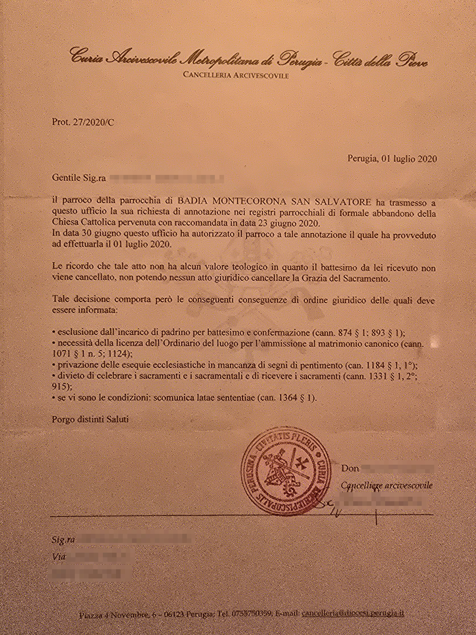 Una persona ha chiesto la rettifica dei dati relativi al proprio battesimo avvenuto a S. Salvatore - UMBERTIDE (PG) il 01/07/2020, dichiarando di non voler più far parte della Chiesa Cattolica.