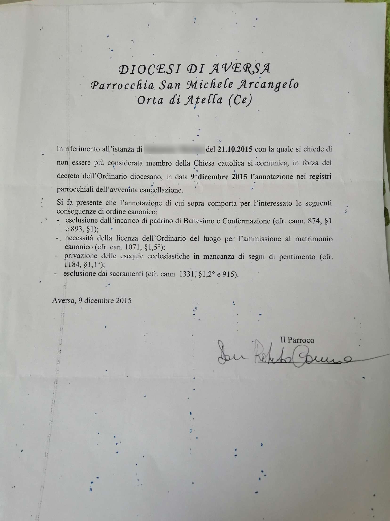 Una persona ha chiesto la rettifica dei dati relativi al proprio battesimo avvenuto a S. Michele - ORTA DI ATELLA (CE) il 09/12/2015, dichiarando di non voler più far parte della Chiesa Cattolica.