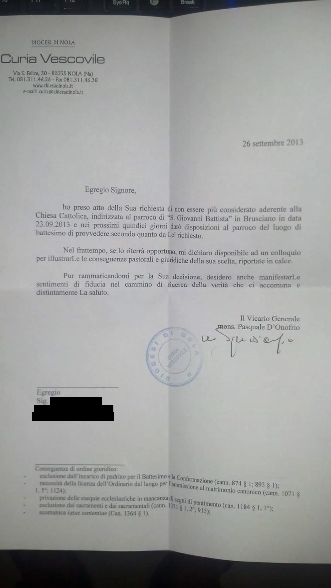 Ho dovuto mandare 3 raccomandate, una al prete che non mi ha risposto e altre due una allo stesso prete e una al vescovo, ma alla fine sono riuscito a liberarmi