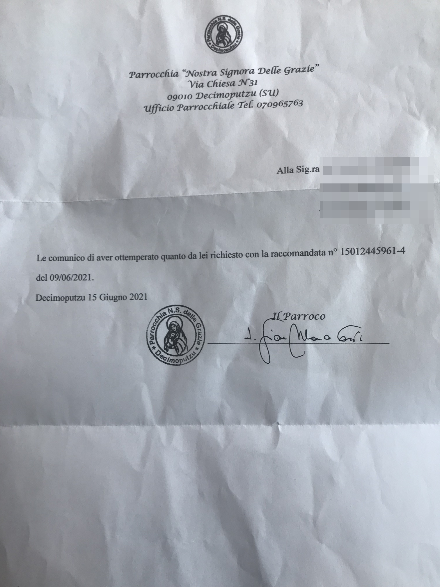 Una persona ha chiesto la rettifica dei dati relativi al proprio battesimo avvenuto a Nostra Signora delle Grazie - DECIMOPUTZU (SU) il 15/06/2021, dichiarando di non voler più far parte della Chiesa Cattolica.