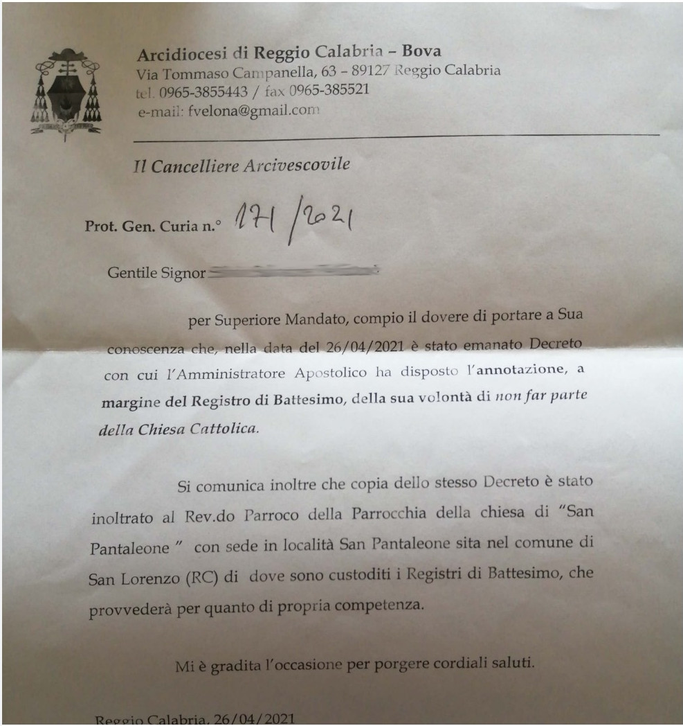 Una persona ha chiesto la rettifica dei dati relativi al proprio battesimo avvenuto a S. Pantaleone - SAN LORENZO (RC) il 26/04/2021, dichiarando di non voler più far parte della Chiesa Cattolica.