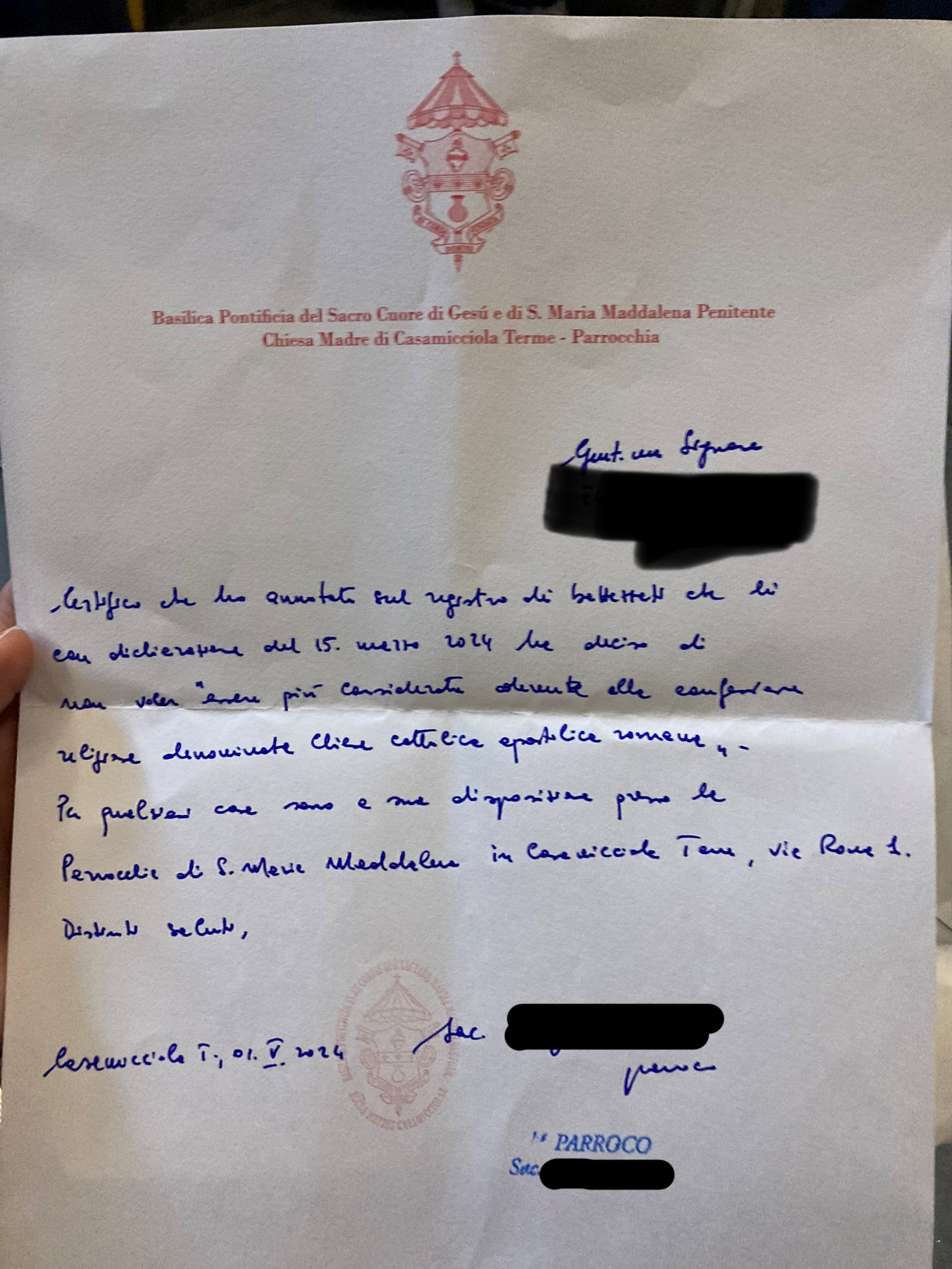 Una persona ha chiesto la rettifica dei dati relativi al proprio battesimo avvenuto a S. Maria Maddalena - CASAMICCIOLA TERME (NA) il 01/05/2024, dichiarando di non voler più far parte della Chiesa Cattolica.