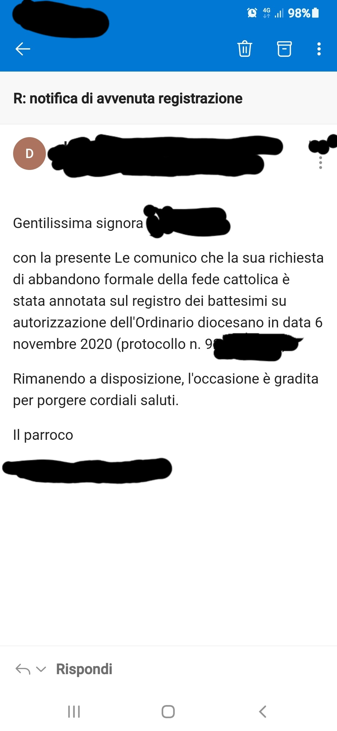 Una persona ha chiesto la rettifica dei dati relativi al proprio battesimo avvenuto a S. Tommaso Apostolo al Pantheon - SIRACUSA (SR) il 22/07/2021, dichiarando di non voler più far parte della Chiesa Cattolica.