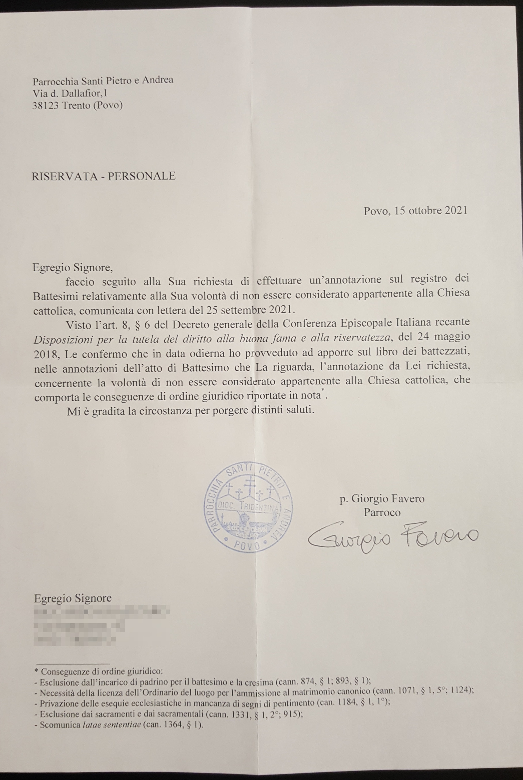 Una persona ha chiesto la rettifica dei dati relativi al proprio battesimo avvenuto a Santi Pietro e Andrea - TRENTO (TN) il 15/10/2021, dichiarando di non voler più far parte della Chiesa Cattolica.