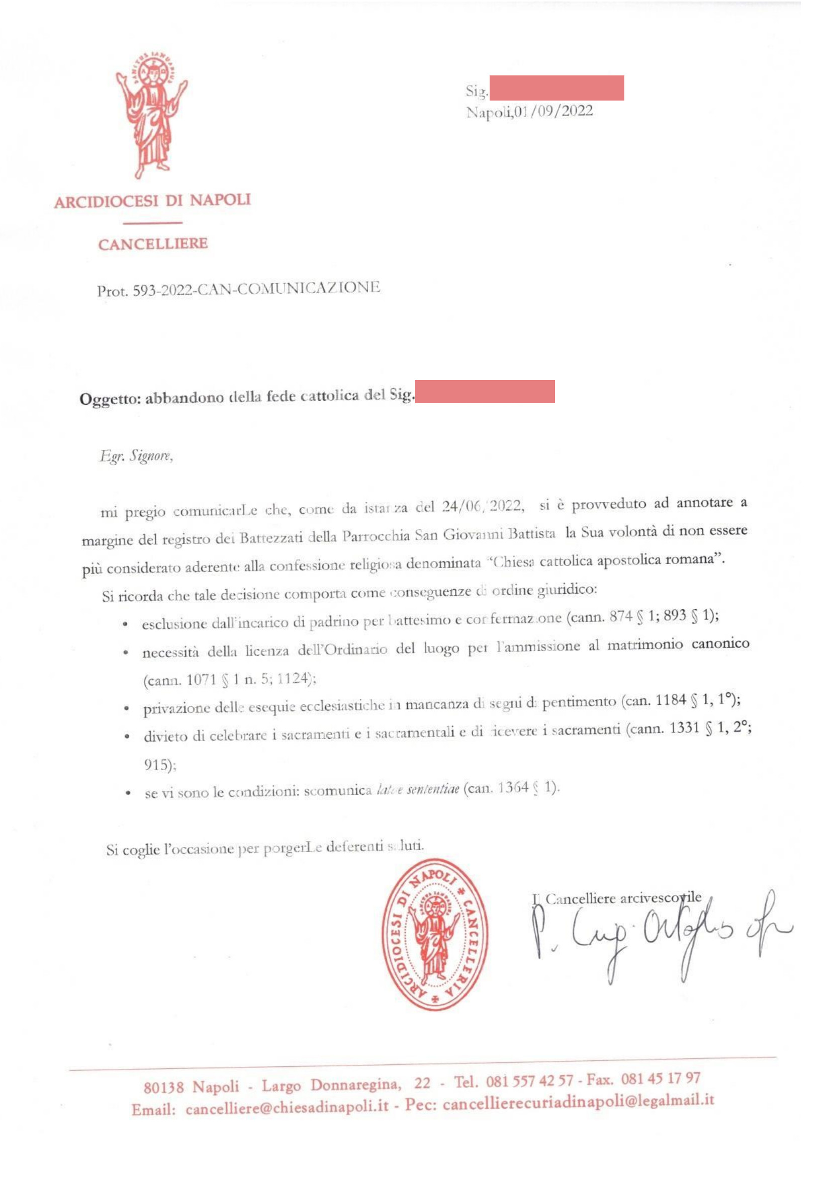 Una persona ha chiesto la rettifica dei dati relativi al proprio battesimo avvenuto a San Giovanni Battista - CASAVATORE (NA) il 01/09/2022, dichiarando di non voler più far parte della Chiesa Cattolica.