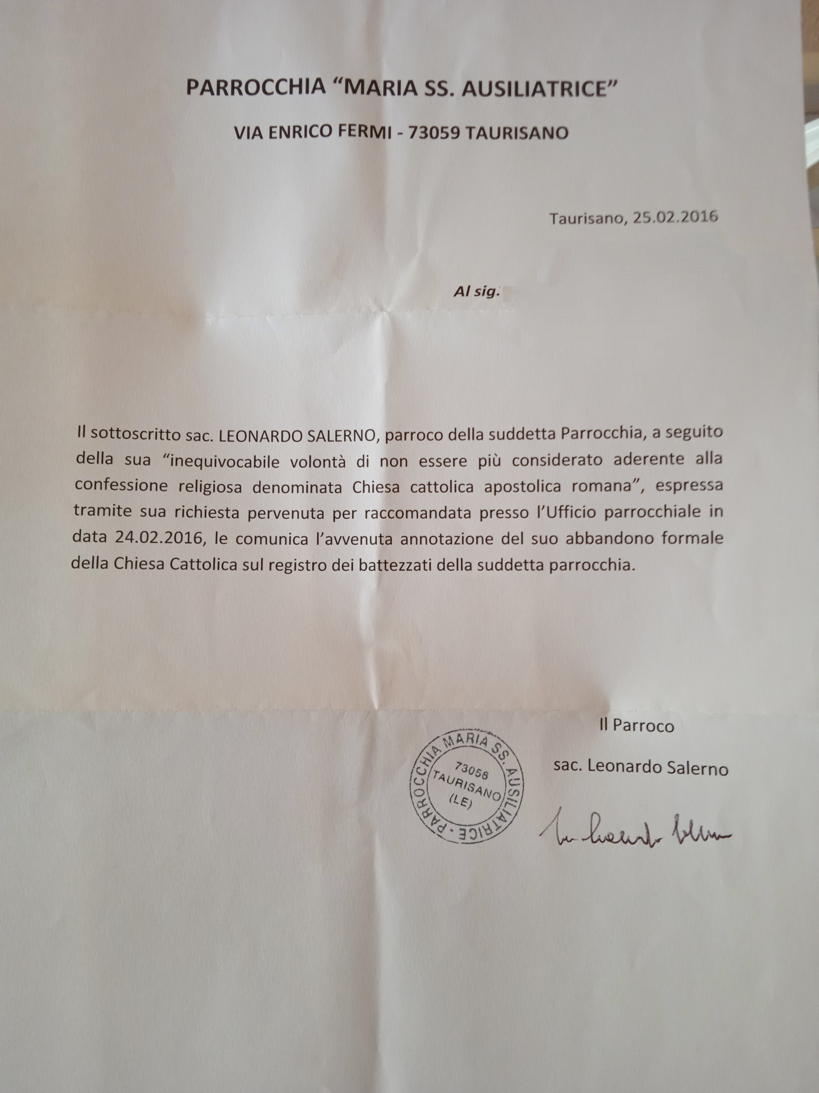 Una persona ha chiesto la rettifica dei dati relativi al proprio battesimo avvenuto a Maria Ss. Ausiliatrice - TAURISANO (LE) il 25/02/2016, dichiarando di non voler più far parte della Chiesa Cattolica.