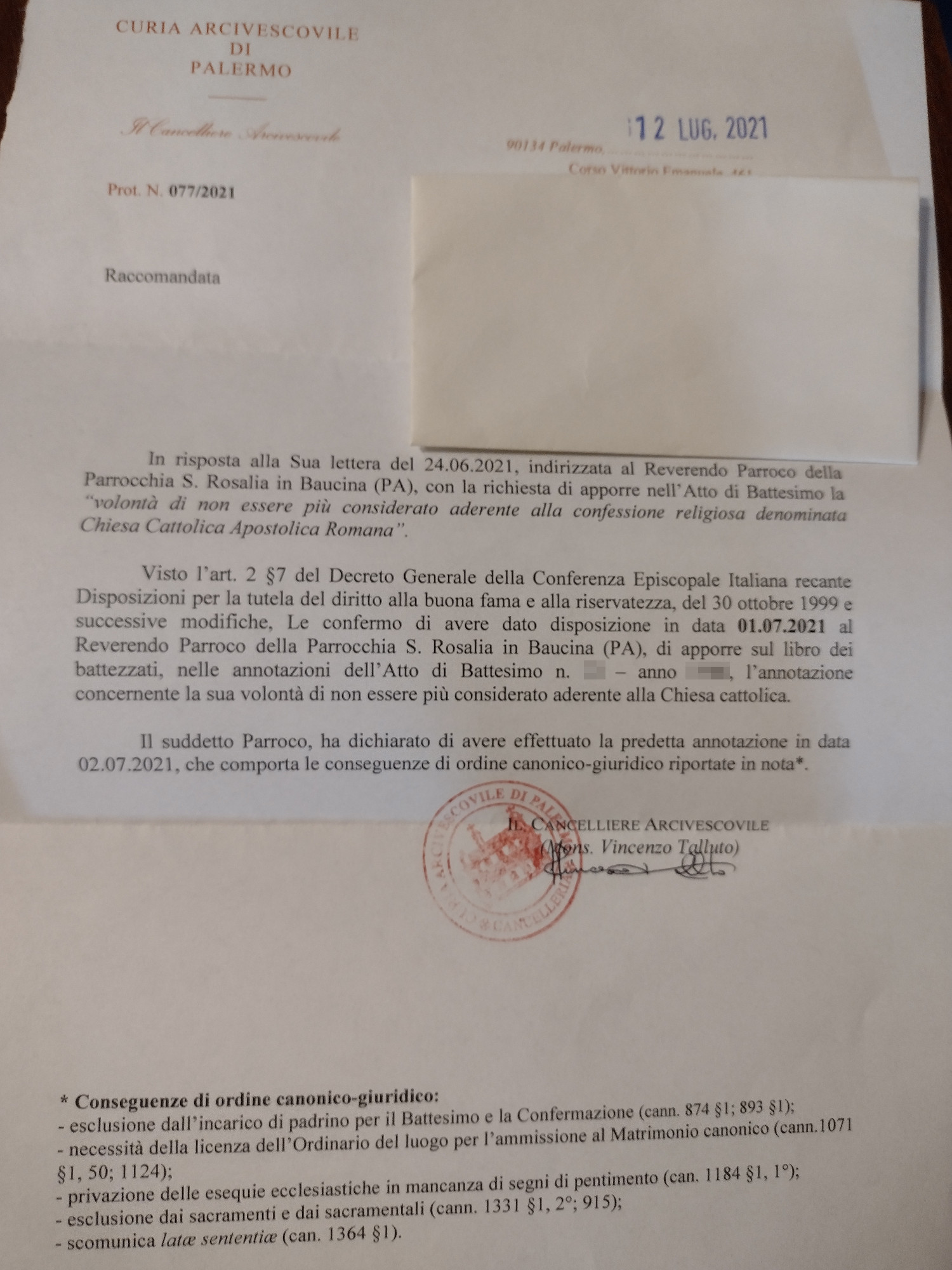 Una persona ha chiesto la rettifica dei dati relativi al proprio battesimo avvenuto a S. Rosalia - BAUCINA (PA) il 02/07/2021, dichiarando di non voler più far parte della Chiesa Cattolica.