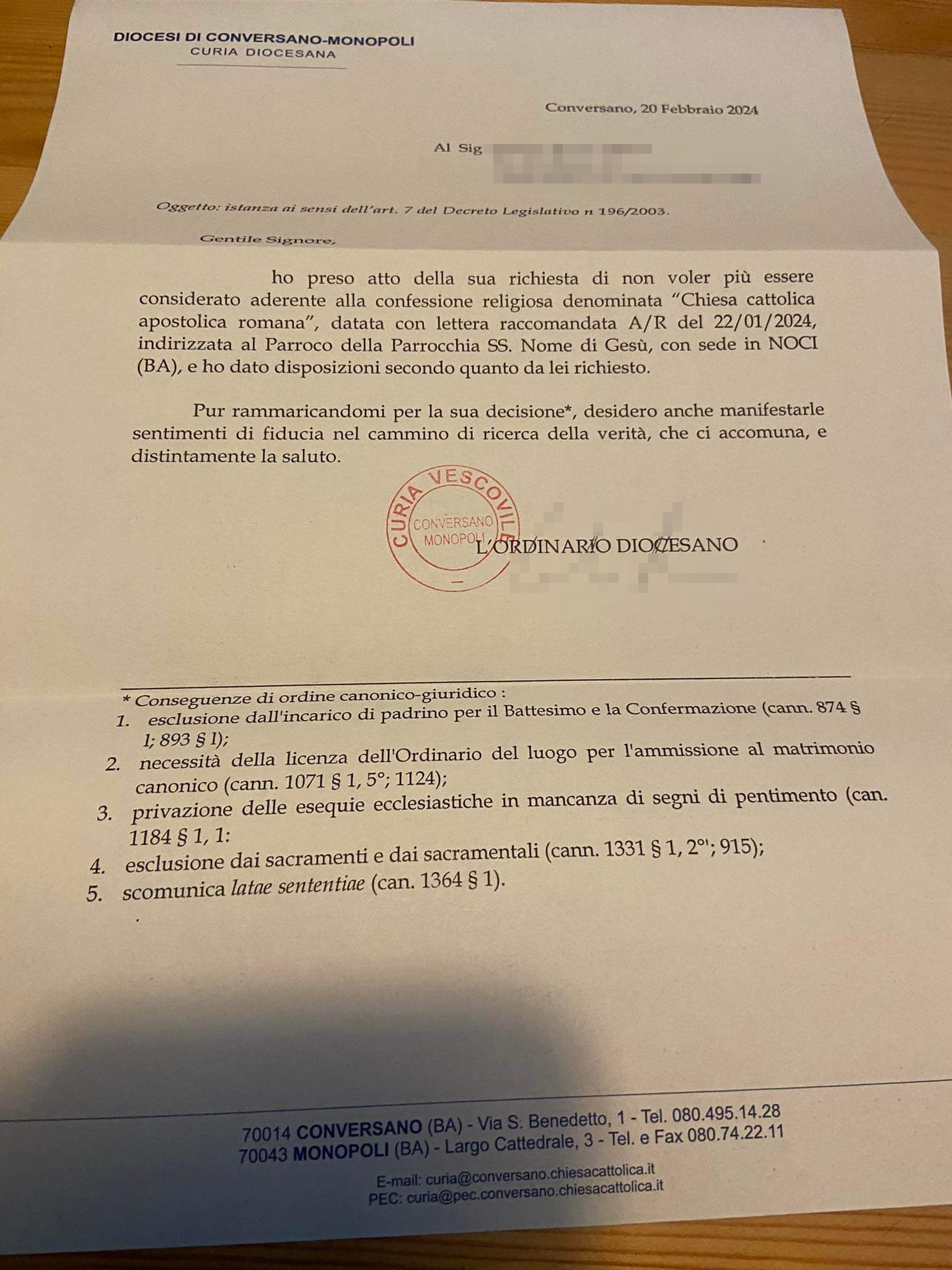 Una persona ha chiesto la rettifica dei dati relativi al proprio battesimo avvenuto a Ss. Nome di Gesù - NOCI (BA) il 20/02/2024, dichiarando di non voler più far parte della Chiesa Cattolica.