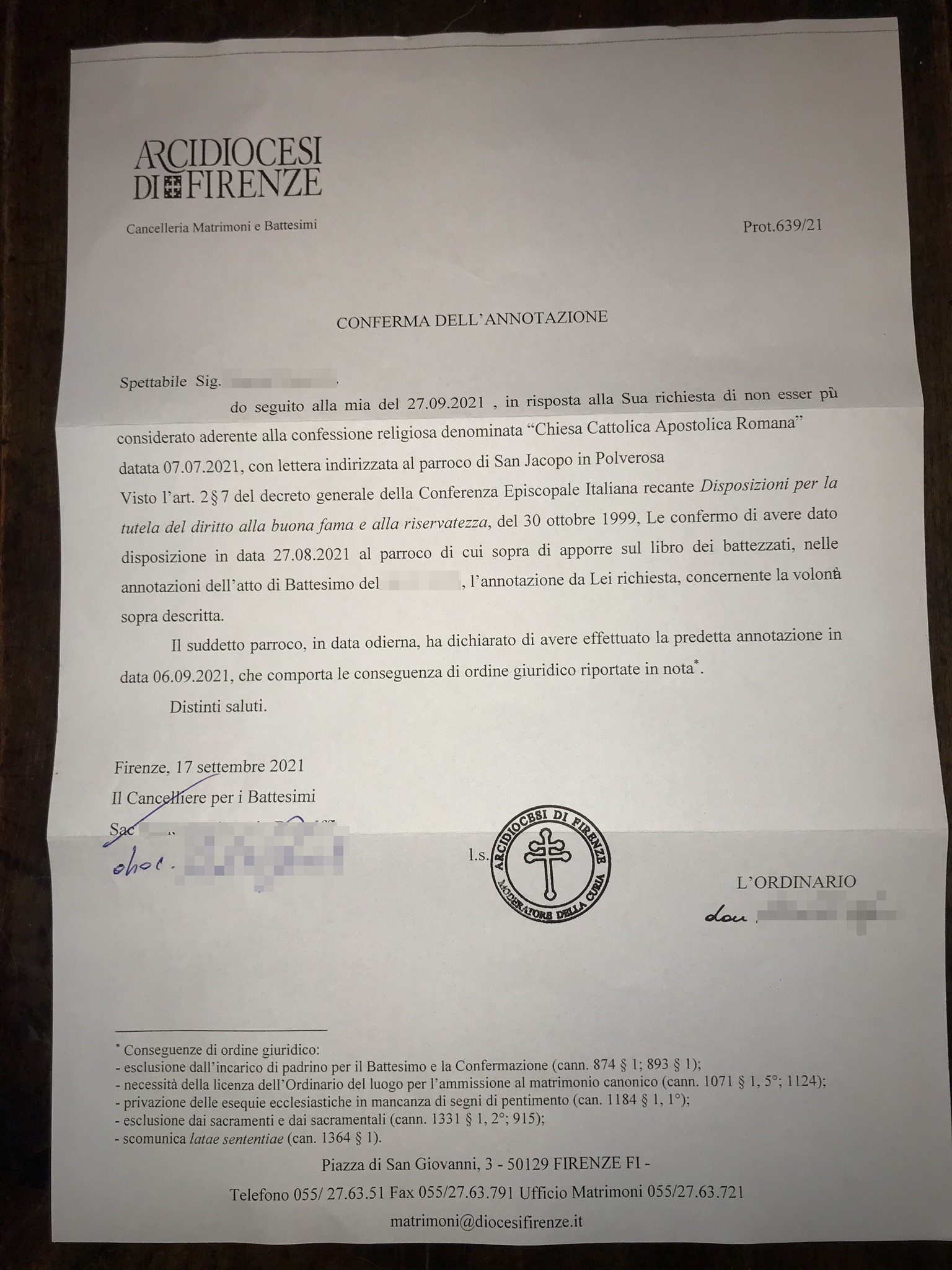 Una persona ha chiesto la rettifica dei dati relativi al proprio battesimo avvenuto a S. Jacopo in Polverosa - FIRENZE (FI) il 17/09/2021, dichiarando di non voler più far parte della Chiesa Cattolica.