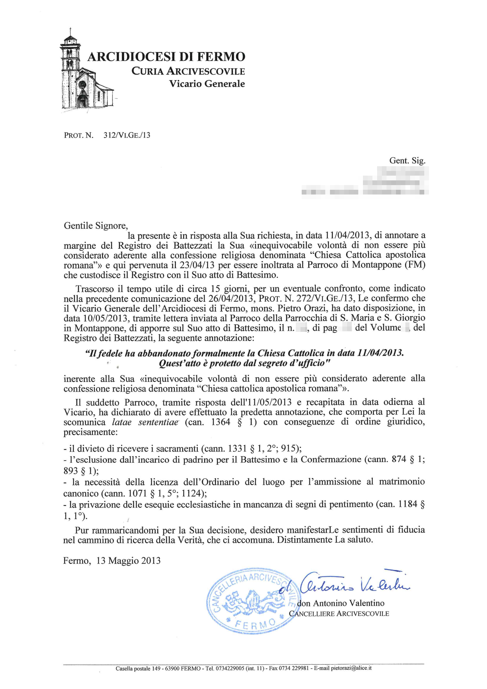 Una persona ha chiesto la rettifica dei dati relativi al proprio battesimo avvenuto a S. Maria e S. Giorgio - MONTAPPONE (FM) il 17/05/2013, dichiarando di non voler più far parte della Chiesa Cattolica.