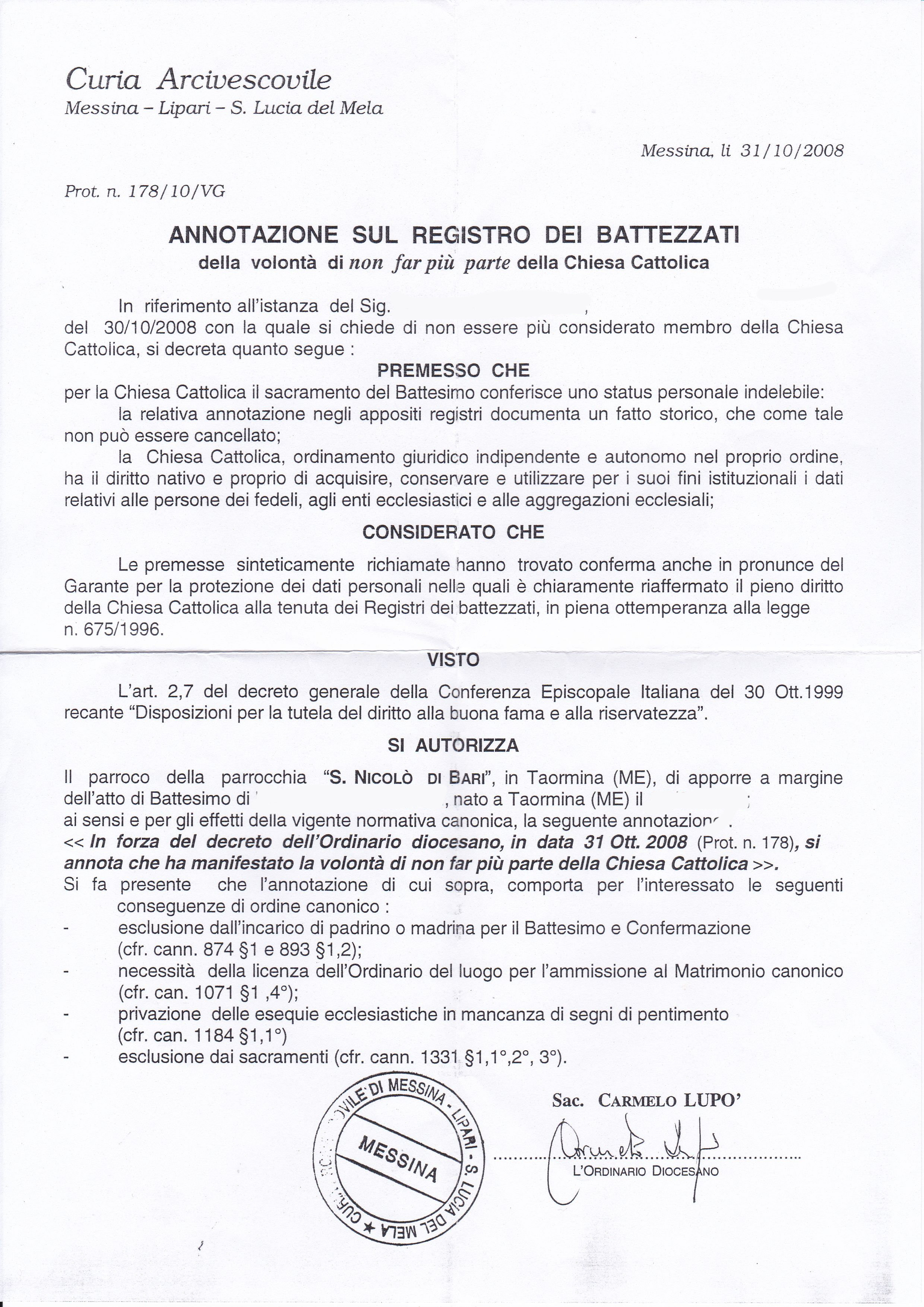 Una persona ha chiesto la rettifica dei dati relativi al proprio battesimo avvenuto a S. Nicolò di Bari - TAORMINA (ME) il 31/10/2008, dichiarando di non voler più far parte della Chiesa Cattolica.