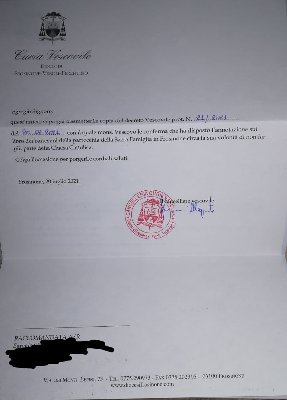 Una persona ha chiesto la rettifica dei dati relativi al proprio battesimo avvenuto a Sacra Famiglia - FROSINONE (FR) il 23/07/2021, dichiarando di non voler più far parte della Chiesa Cattolica.