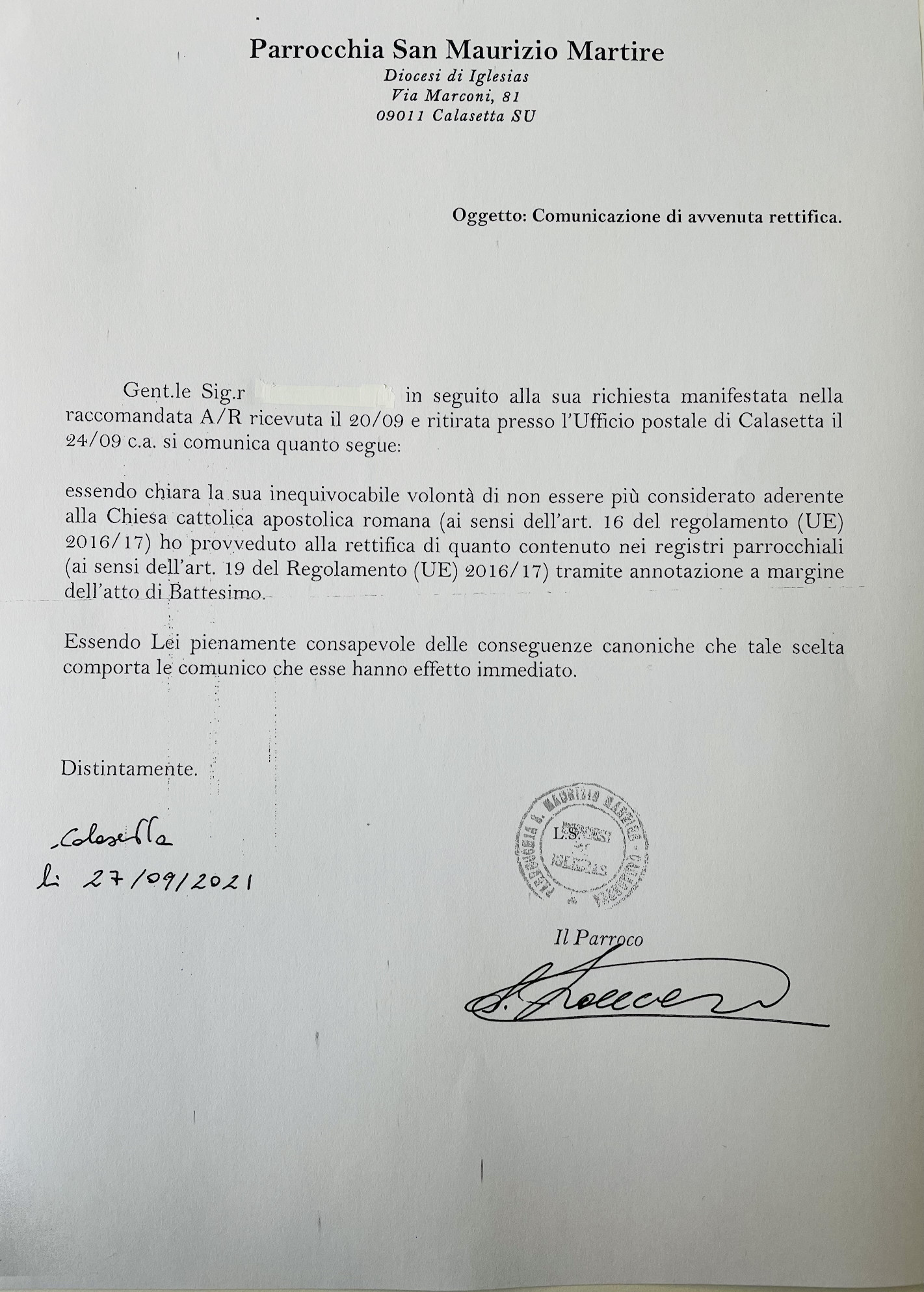 Una persona ha chiesto la rettifica dei dati relativi al proprio battesimo avvenuto a S. Maurizio Martire - CALASETTA (SU) il 27/09/2021, dichiarando di non voler più far parte della Chiesa Cattolica.