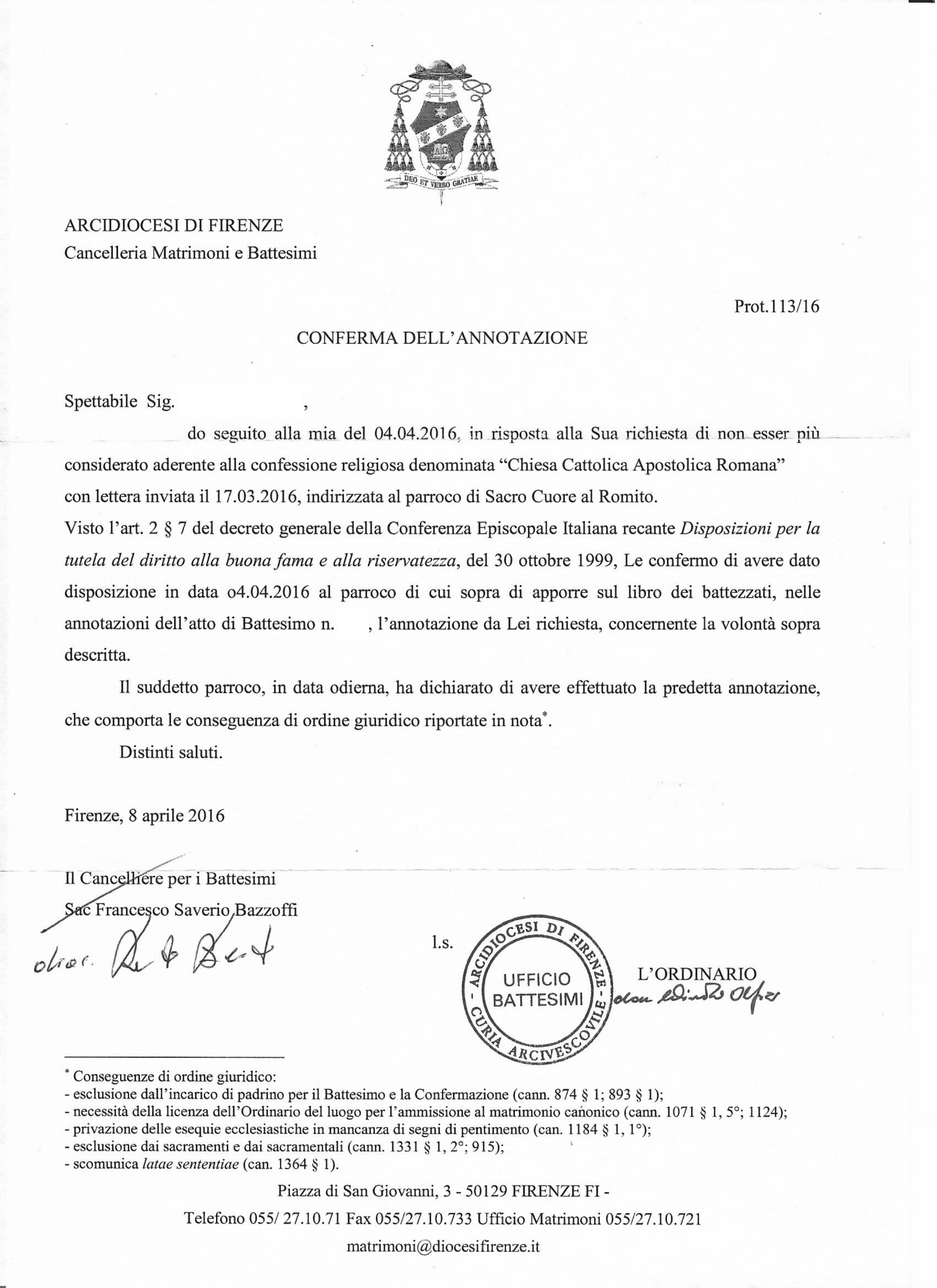 Una persona ha chiesto la rettifica dei dati relativi al proprio battesimo avvenuto a Sacro Cuore al Romito - FIRENZE (FI) il 08/04/2016, dichiarando di non voler più far parte della Chiesa Cattolica.